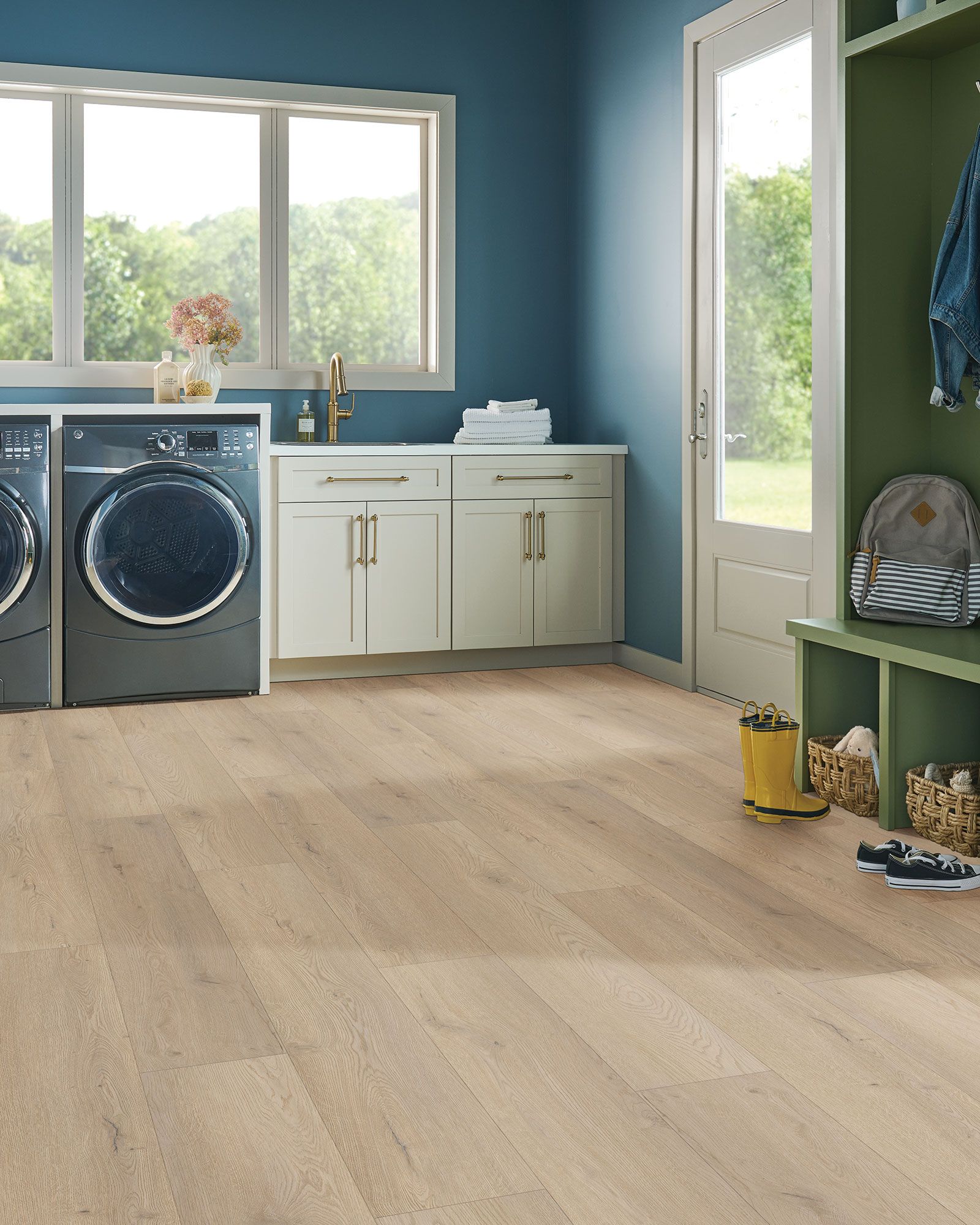The Robbins Horizon's Embrace Seabreeze 9"x60" Rigid Core Luxury Vinyl rigid core flooring captures the expansive beauty of nature with wide-plank designs inspired by rugged landscapes, coastal shores, and open horizons. Crafted with a high-performance WPC (wood plastic composite) core, this waterproof flooring blends natural wood fibers with advanced polymers for enhanced dimensional stability, impact resistance, and long-term durability. Extra-wide 9-1/4 in oak-look planks with EIR texture and ultra-matte finish deliver authentic wood realism while standing up to everyday wear. Designed for active households, Horizon’s Embrace is 100% waterproof, scratch and dent resistant, and kid- and pet-friendly. A durable 20-mil wear layer protects against heavy foot traffic, while the 1.5 mm attached IXPE pad provides sound reduction and a softer feel underfoot. The easy angle-lock installation requires no acclimation and works above, on, or below grade - making it ideal for any room in the home. Backed by a Lifetime Limited Residential Warranty and 15-Year Light Commercial Warranty, this rigid core flooring delivers natural beauty with modern performance.