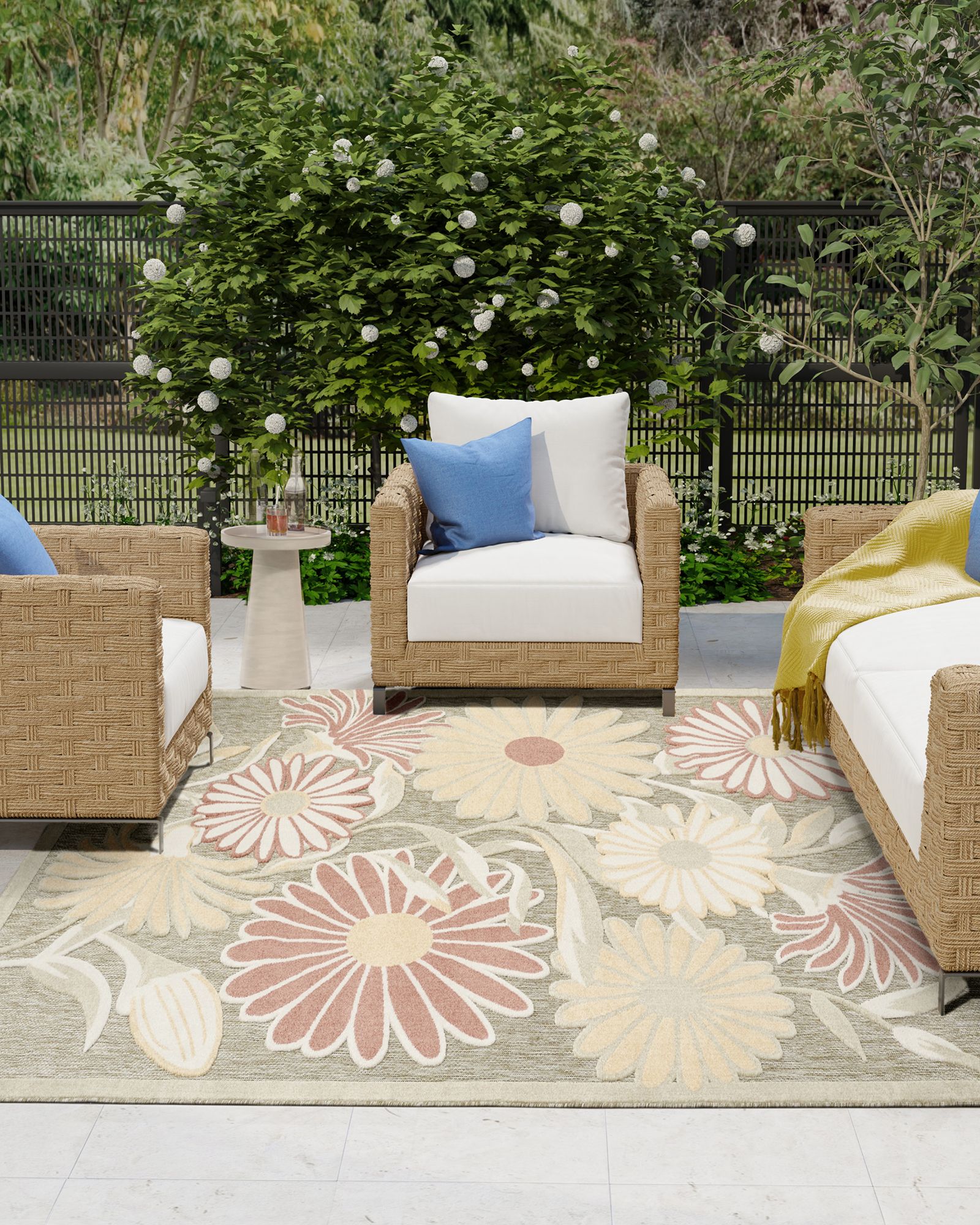 Bring a touch of nature to your floors with this sage, rose, and yellow floral outdoor rug from the Nourison Aloha ALH33 Sage Rose 2'8"x4' Area Rug Collection. The oversized daisy pattern truly pops thanks to a subtly raised finish that adds a surprisingly soft texture to the flatwoven surface. This contemporary rug is stylish and functional, pulling double duty as a foundation for both your indoor and outdoor spaces. Hand washable outdoors: rinse with a hose and air dry. This sunny and sensational collection of flat woven outdoor rugs is pretty, practical and simply perfect for high traffic areas. With its inviting assortment of classic and contemporary designs, tempting color palettes and terrific textures, these multipurpose rugs will afford an air of simple sophistication to any environment.