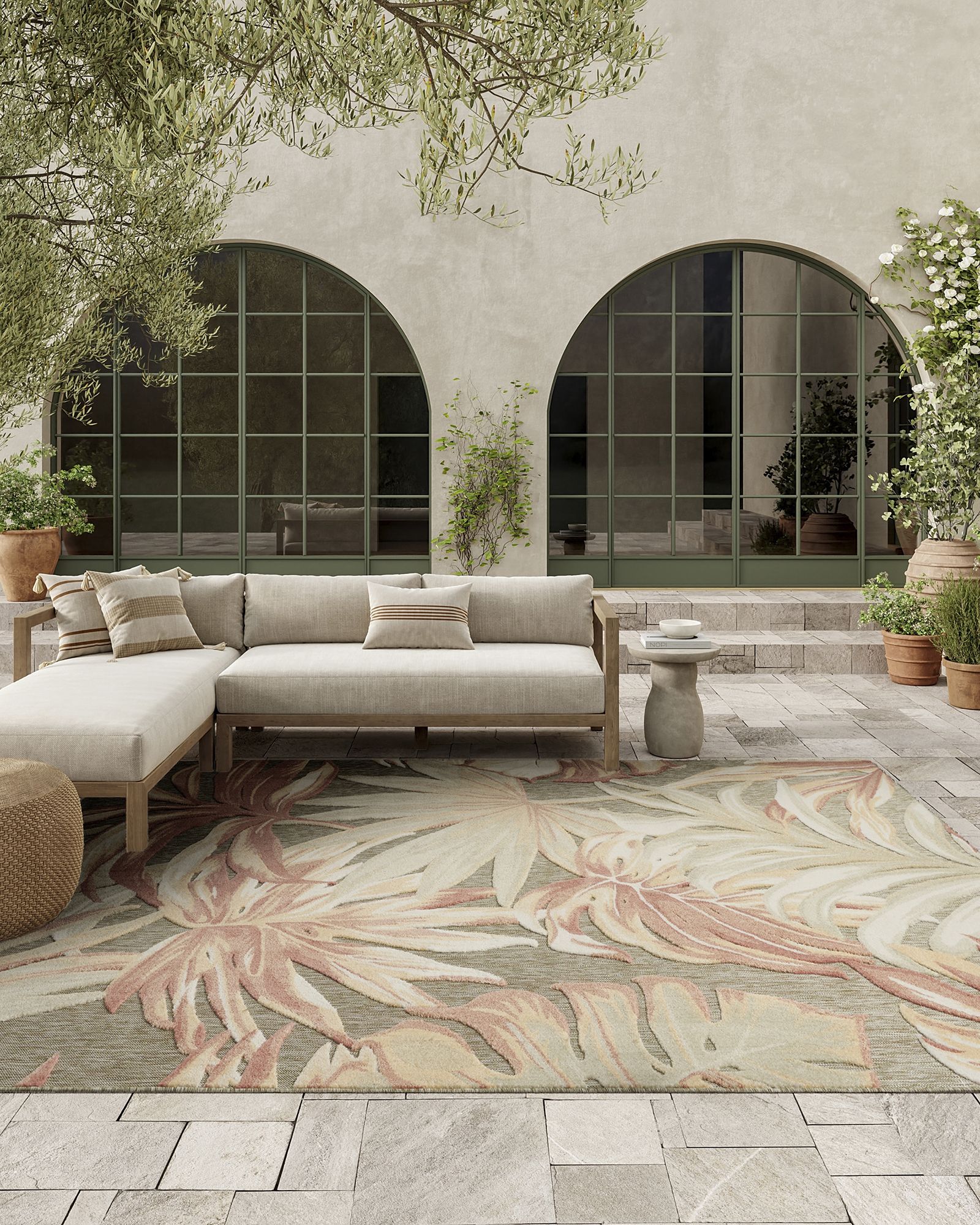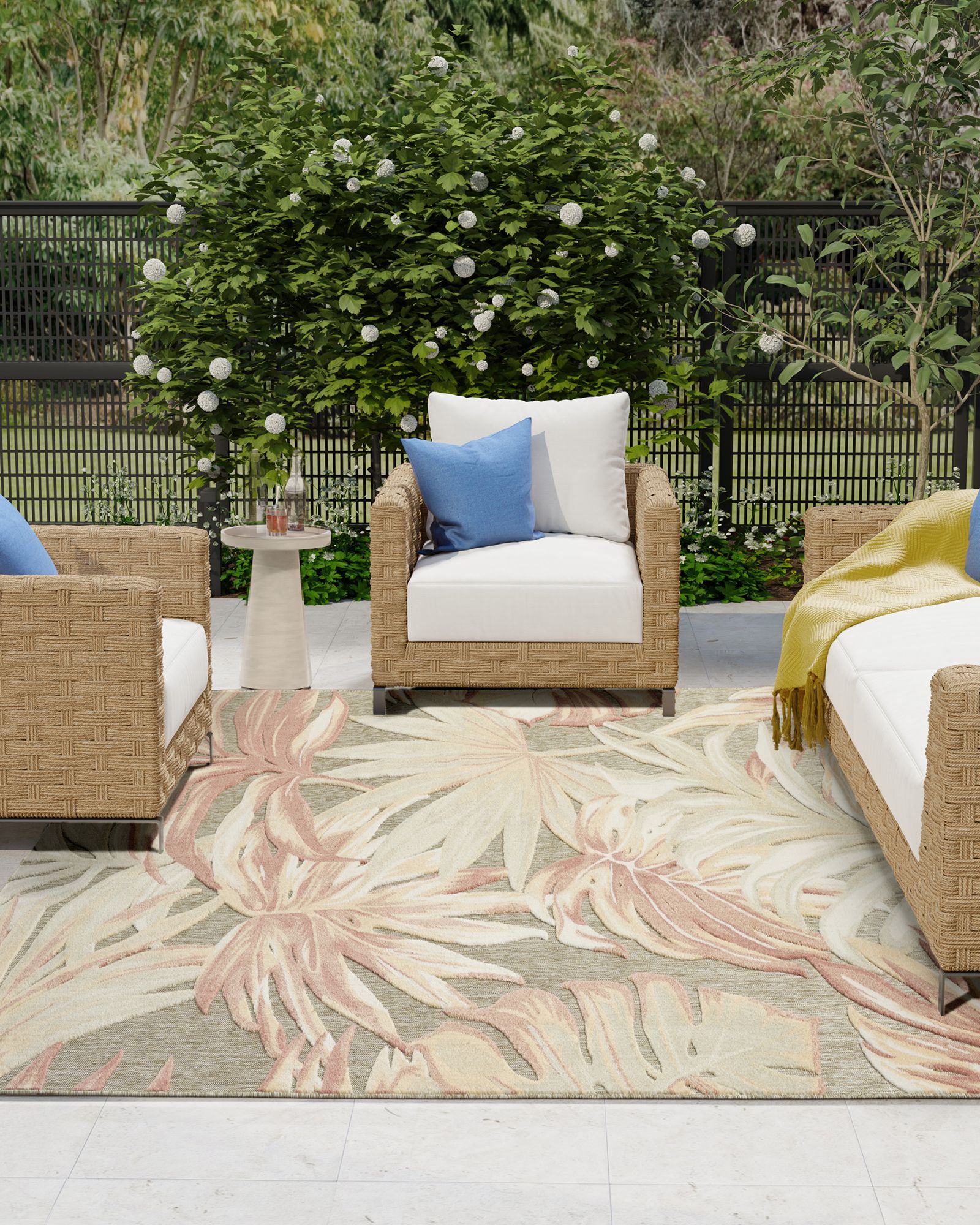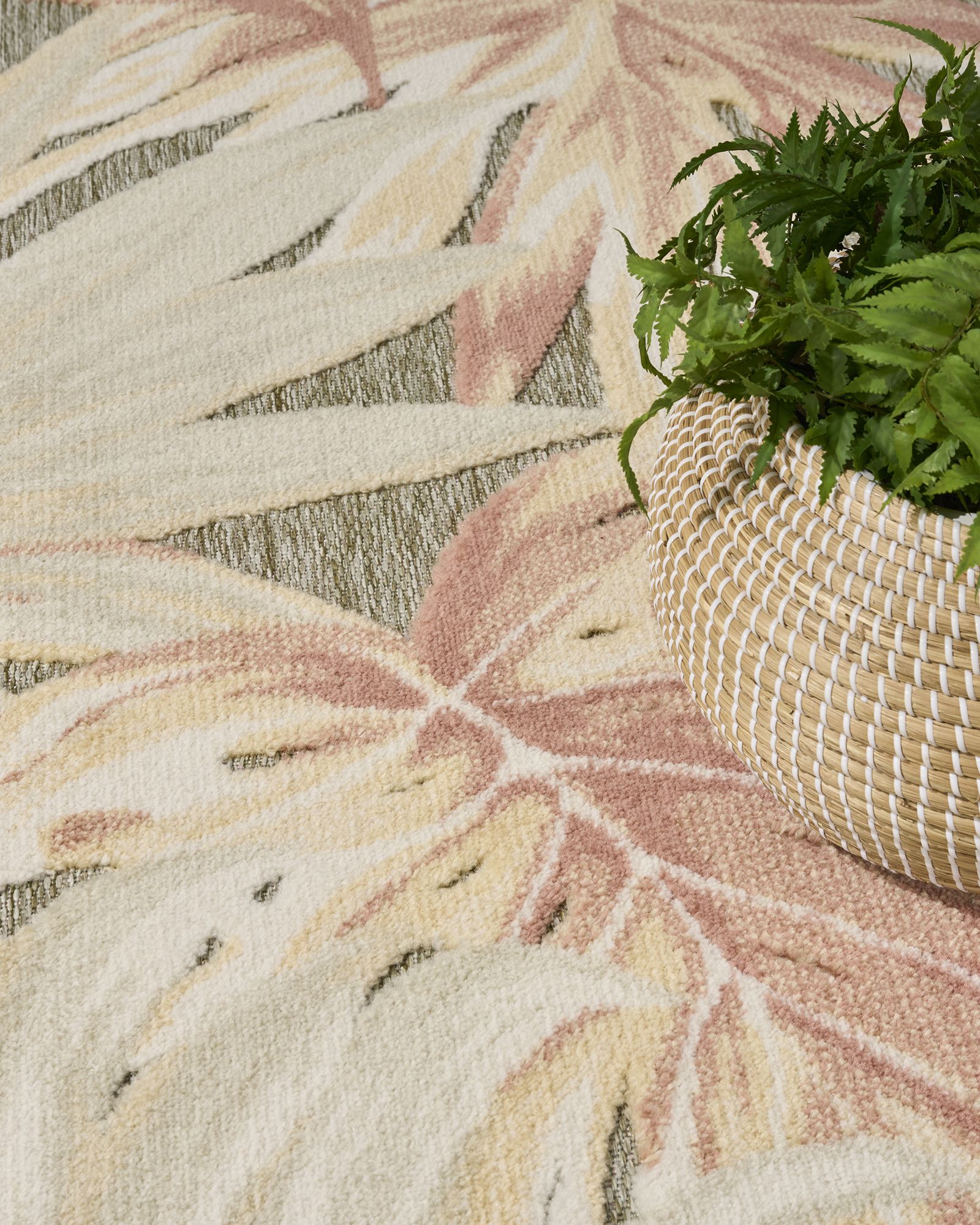 Bring the warm and relaxing feel of a tropical retreat to your space with this ivory and sage outdoor rug from the Nourison Aloha ALH43 Sage Rose 2'8"x4' Area Rug Collection. Oversized botanical leaves sprawl across the surface, complete with tonal shading that channels the sun-dappled beauty of a lush paradise. The high-low cut pile adds a stunning dimensional effect and soft texture ideal for indoor and outdoor areas alike. Made from polypropylene, this tropical rug is designed to withstand the elements – great for busy households with pets and young children. This sunny and sensational collection of flat woven outdoor rugs is pretty, practical and simply perfect for high traffic areas. With its inviting assortment of classic and contemporary designs, tempting color palettes and terrific textures, these multipurpose rugs will afford an air of simple sophistication to any environment.