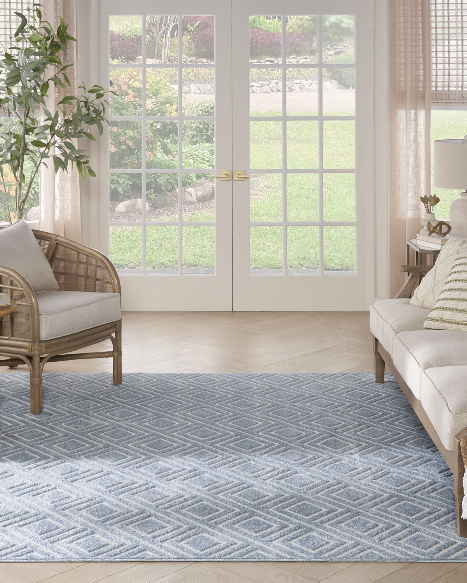 Modern style meets comforting texture through the Nourison Care Free CAF03 Blue Area Rug Collection. Designed with busy households in mind, these rugs are the epitome of versatility: soft colors to easily complement any style of decor, a hard-wearing construction, and a high-low dimensional texture that friends, family, and pets will love. Choose from a variety of sizes – from large 8x10 rugs for the living room to runner rugs for the kitchen and bathroom – to create a cohesive look throughout the house. Bring a chic yet relaxed vibe to your space with this beige diamond rug from the Care Free Collection. The geometric pattern is presented in a simple two-tone palette that makes it easy to decorate with, while the dimensional high-low pattern adds a unique sense of depth designed to wow friends and family. Made from softly textured yet hard-wearing polypropylene for stress-free maintenance.