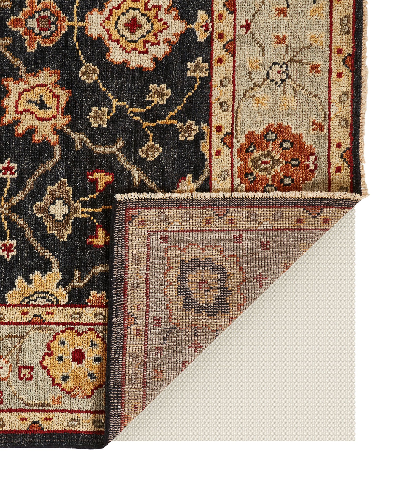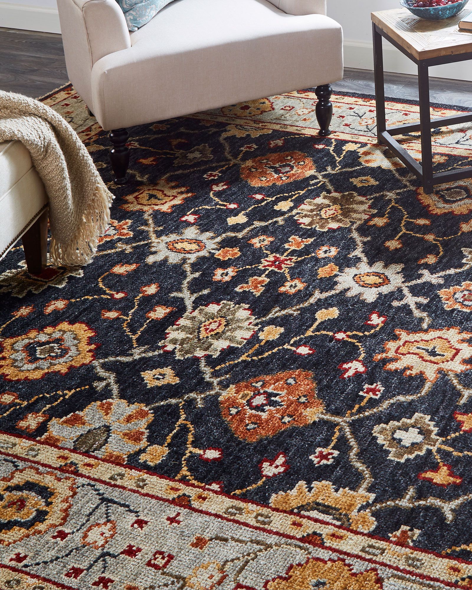 Hand knotted premium wool in India, the Feizy Carrington 6500F Black/Gold/Gray area rug collection showcases traditional Oushak inspired motifs with ornamental design and subtle fringe accents on the edges. The age-old techniques of natural hand dying creates varying degrees of color saturation in the warm and cool tones throughout the rug. Available in a complementary color palette of gray blue, beige, and burnt reds, the wool fiber offers natural resistance to spills, stains, and high foot traffic.