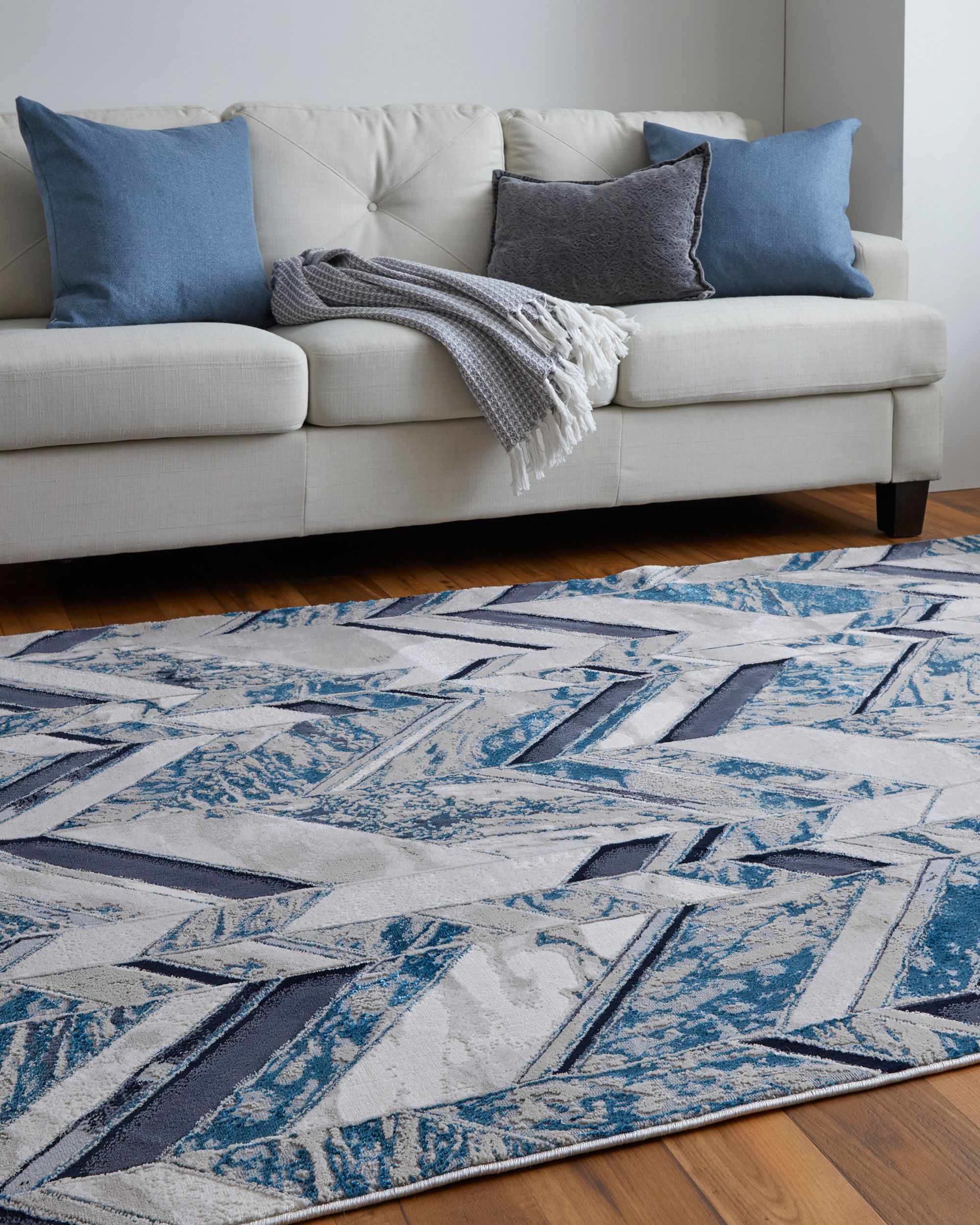 The Feizy Indio 39H1F Ivory/Blue/Gray collection is woven in Turkey with polypropylene and polyester. Because of the blend of fabrics in this area rug, the rug is easy to care for and can easily withstand high traffic areas. Since the blend of materials makes this rug stain and fade resistant, the blue, navy, grey, and off-white color combination makes a contemporary statement. The subtle marble-inspired, geometric lines, and abstract chevron patterns of the rug come in neutral colors of light blue, warm gray, and ivory.