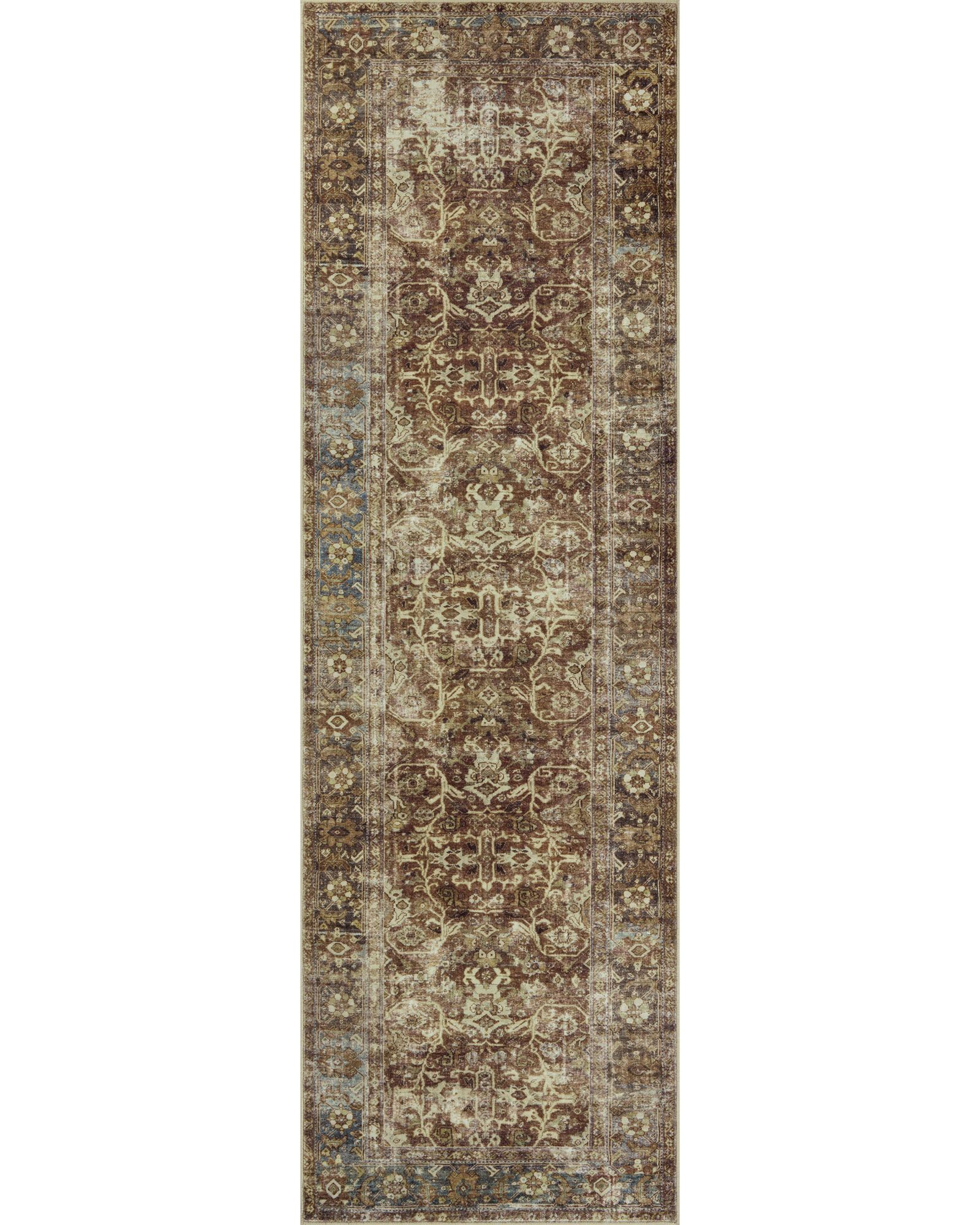 The Sinclair SIN-01 Rust/Lagoon Collection for Magnolia Home by Joanna Gaines x Loloi is power-loomed of polyester, including 58% Global Recycling Standard (GRS) certified recycled polyester (made from recycled plastic bottles), certified by Control Union 1171944. Sinclair area rugs have incredible softness and durability comparable to classic power-loomed rugs, while also reducing waste in their production. This collection is also machine-washable, making it an ideal rug in high-traffic living rooms, hallways, entryways, and children’s rooms. The design features antique motifs with intricate details and slight distressing, creating a sophisticated, storied feel.