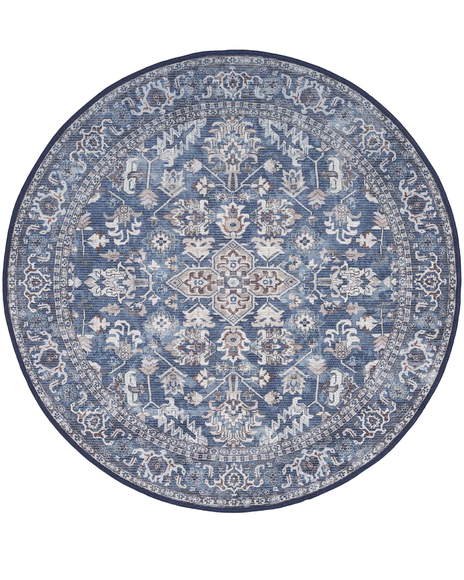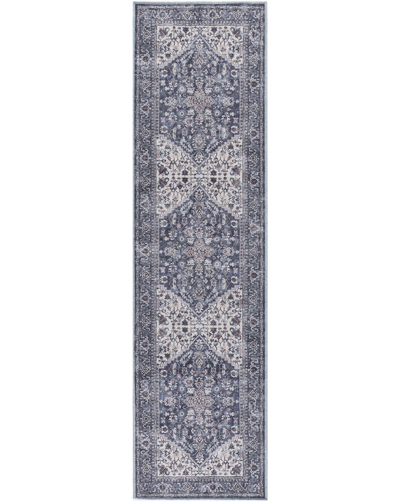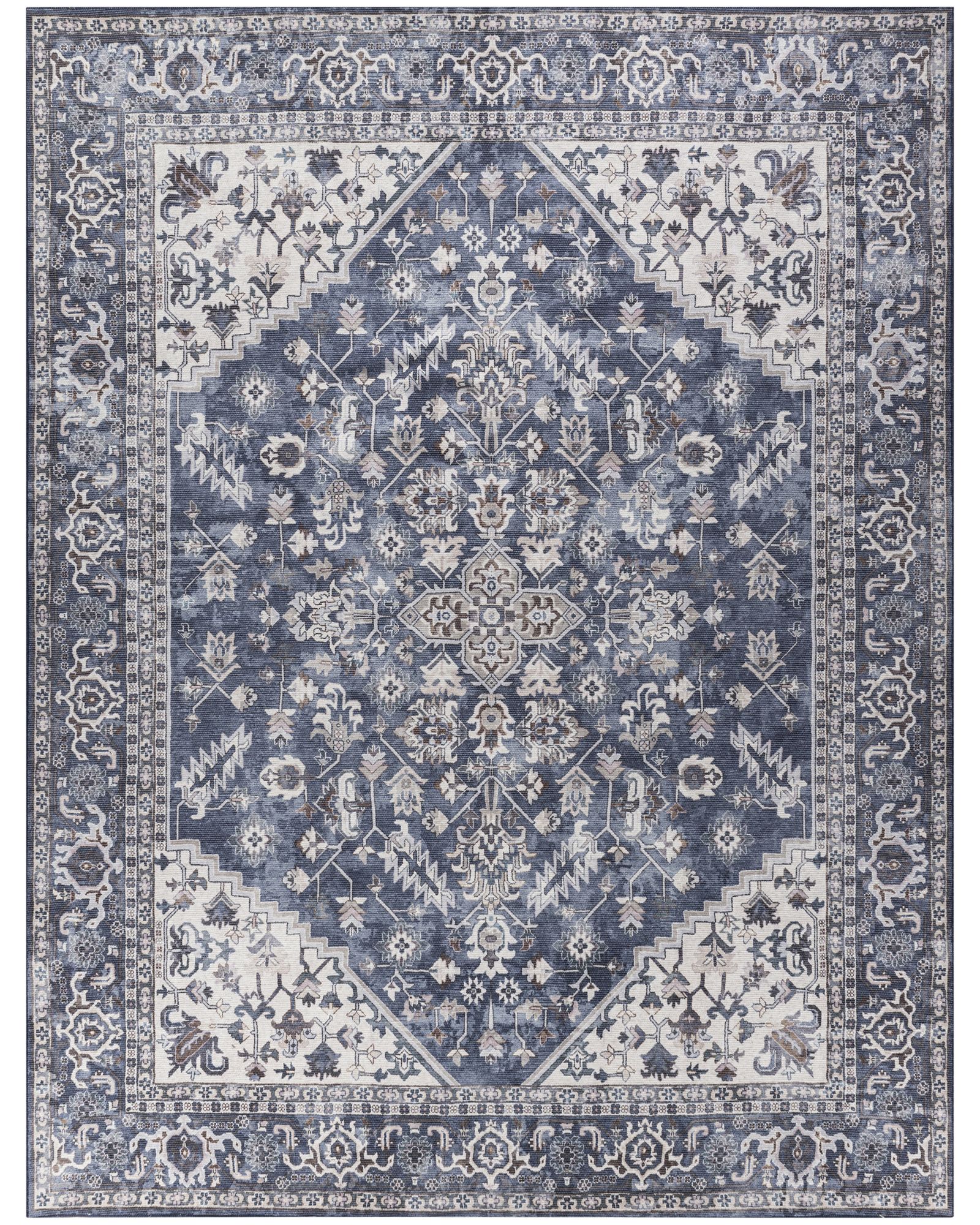 With understated hues and a classic medallion design, this rug from the New Concept Washables SR104 Navy Ivory 10'x14' Area Rug Collection fits effortlessly in any setting. Its printed surface presents a floral medallion design in navy blue and ivory, paired with a decorative border for vintage-inspired charm. Soft, flat-woven chenille and cotton fibers make this rug both stylish and easy to clean. The New Concept Washables Collection channels the vibrant spirit of the past through intricately printed Persian floral and tribal designs. These vintage-inspired rugs create a welcoming sanctuary in your home, with each design featuring a distinctively distressed finish for a lived-in charm. New Concept rugs are crafted with a machine-washable blend of flat woven chenille and cotton fibers, offering a soft texture and easy cleaning.