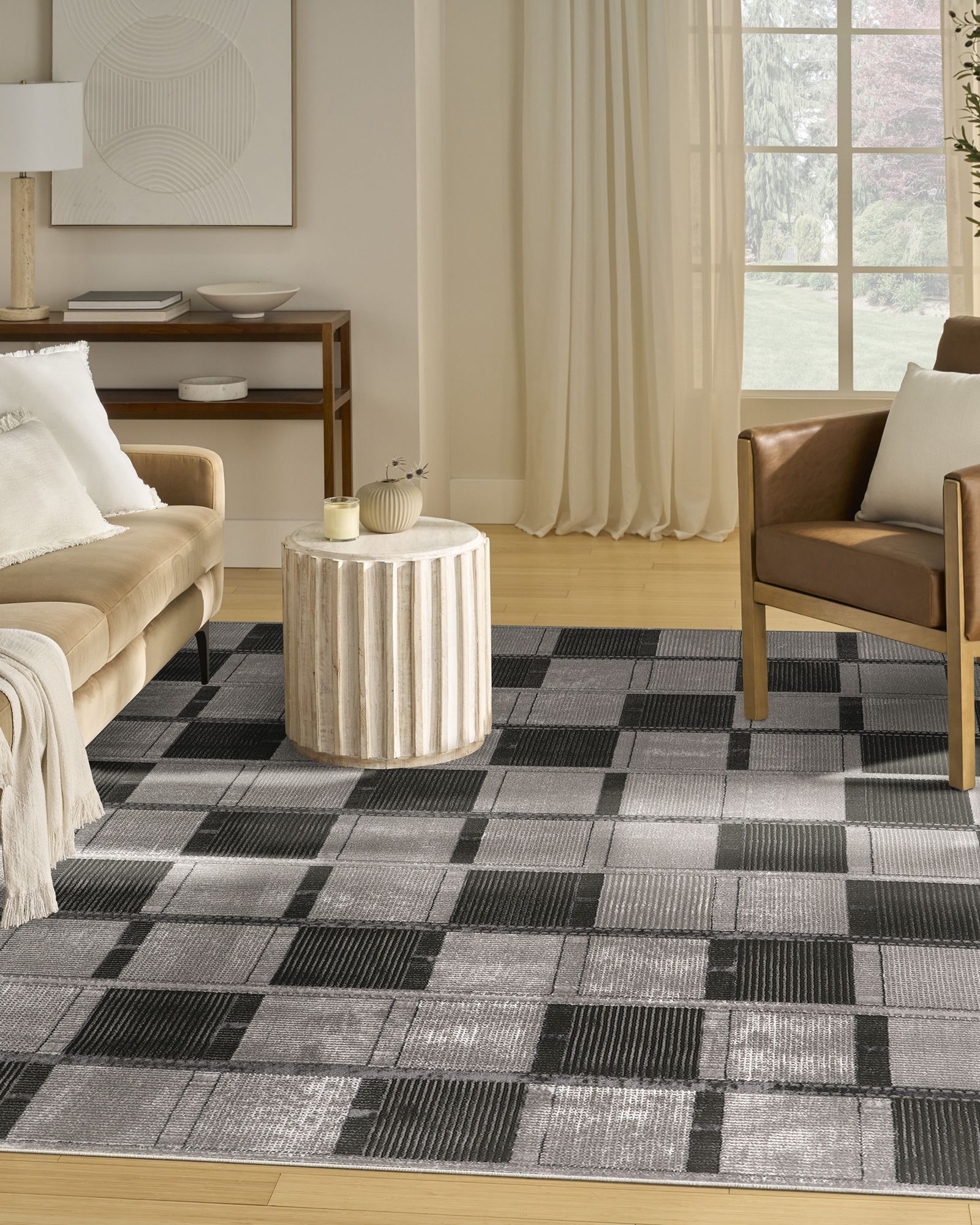 Invite clean, understated elegance to your decor with the Nourison Nordic NRC09 Grey Black Area Rug Collection. These abstract and geometric rugs draw inspiration from the principles of Scandinavian design to bring you simple, yet impactful looks that help create a more serene atmosphere. Each style is finished with a subtle sheen and high-low dimensional pile that adds visual appeal without overwhelming your space. Choose from a variety of sizes to create a coordinated look between rooms – from runners for the kitchen and bathroom to large 8x10 rugs for the living room. Create a calming atmosphere in your home with this geometric rug from the Nordic collection. The repeating pattern, enhanced by a subtle shimmer and high-low pile that adds depth and dimension. Made in soothing neutral tones, this Scandinavian-inspired rug seamlessly complements a variety of decor styles.