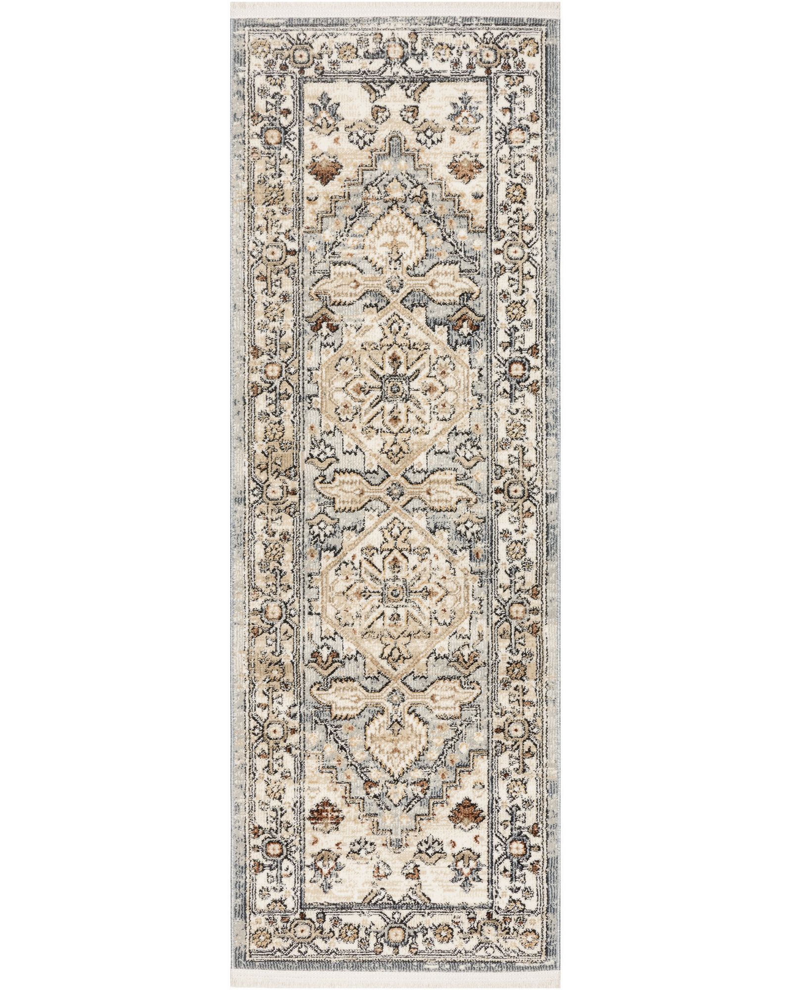 Invite relaxed yet refined appeal to your space with this vintage-style blue rug from the Pardis PRD02 Blue Taupe 4'x6' Area Rug collection. The intricate central medallion pattern and matching border is finished with an artful fade and fringe edges that add a dainty look to your surroundings. The low-profile design and soft texture make it a versatile foundation for both traditional and modern spaces. The Pardis collection brings together traditional design and everyday ease. These vintage-style rugs are made with a low-profile construction finished with fringe for added charm. Available in a range of muted tones and timeless motifs that easily complement a variety of spaces, including cottagecore, farmhouse, traditional, and contemporary decor.