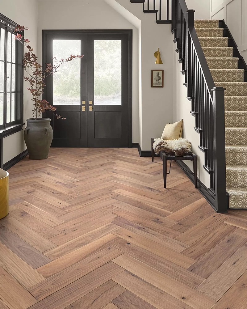 By simply utilizing hardwood planks of differing widths, you’ll be creating a look that’s all your own. You can also use design patterns like the quite striking herringbone wood floor you see featured here. A chevron hardwood floor is yet another way to stand out from the crowd. We can’t wait to see what you come up with.