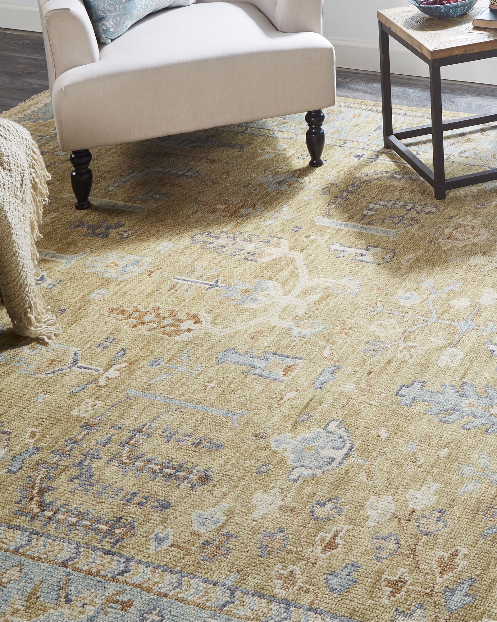 | Description | Hand knotted premium wool in India, the Feizy Carrington 6501F Gold/Blue/Gray 11'6"x15' Area Rug collection showcases traditional Oushak inspired motifs with ornamental design and subtle fringe accents on the edges. The age-old techniques of natural hand dying creates varying degrees of color saturation in the warm and cool tones throughout the rug. Available in a complementary color palette of gray blue, beige, and burnt reds, the wool fiber offers natural resistance to spills, stains, and high foot traffic. |