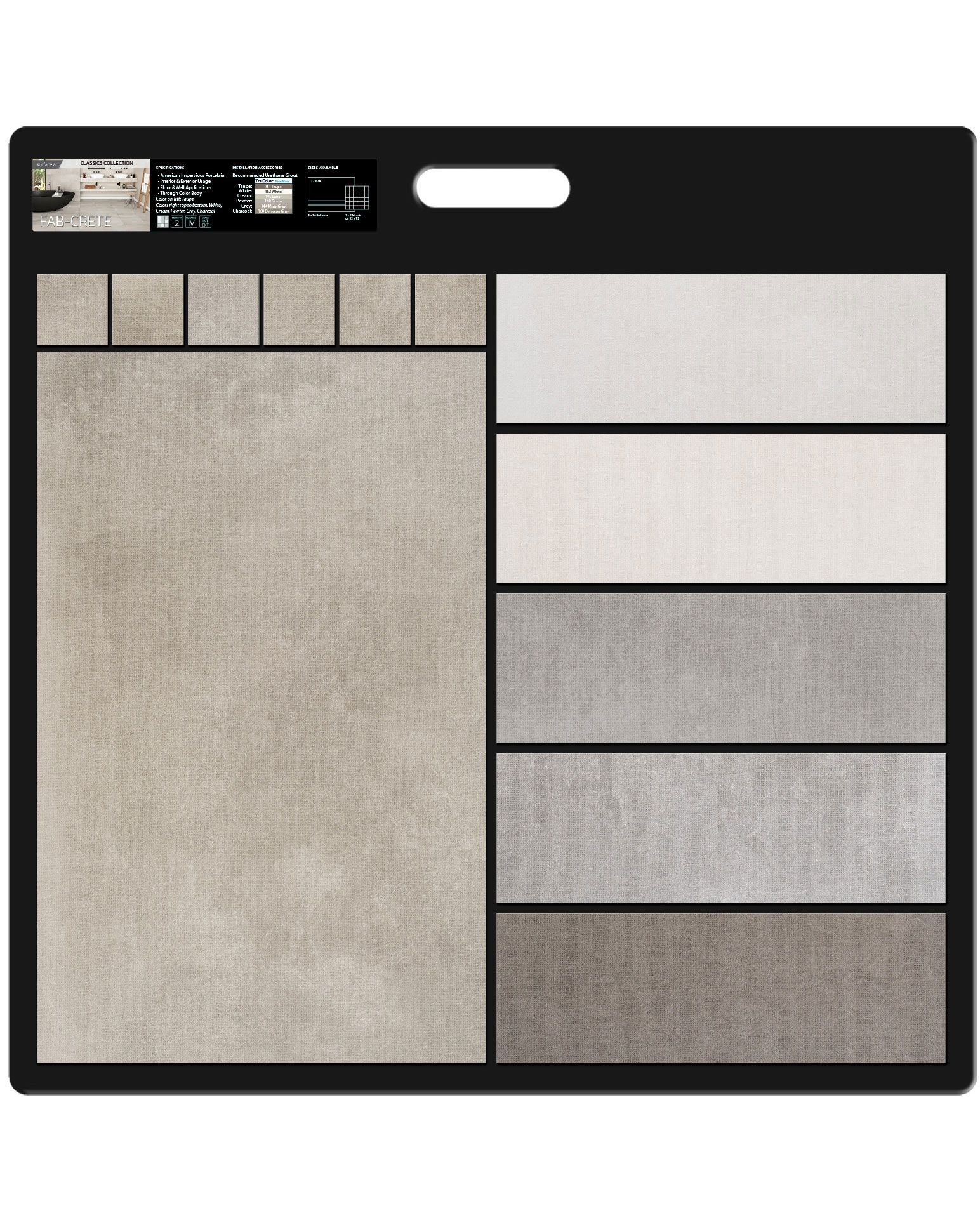 | Description | The Surface Art Fab-crete Taupe Tile Collection features a cement look, matte finish, porcelain body, pressed edge, and is made in the USA. Product Installation - Wall/Floor. Slight variation in texture and/or patterns between tiles but similar color schemes. Suitable for moderate to heavy traffic. This tile is freeze resistant, stain resistant, and has a commercial rating. |