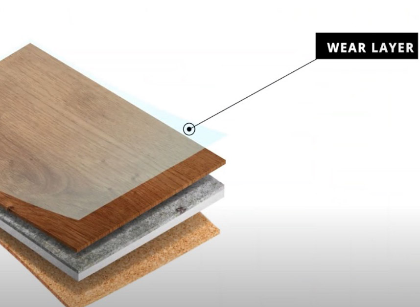 The wear layer is the transparent protective coating that shields the design layer and determines the floor's longevity.