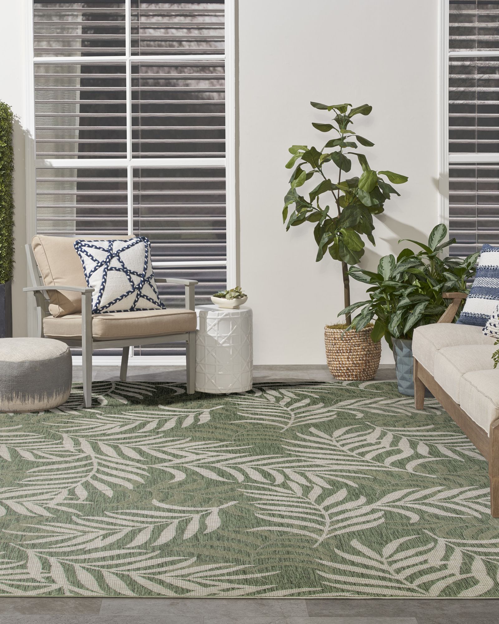 | Description | Tropical with a touch of modern, the Nourison Garden Oasis GOA01 Green Ivory Area Rug Collection of outdoor rugs transforms any space into a breezy retreat. With a modern color palette and low-maintenance construction, these flat weave rugs are built for performance but don’t sacrifice style. The lightweight construction lays flat quickly and doesn’t shed, so you can spend less time waiting for your space to come together and get right to relaxing with friends and family. Roll out this Garden Oasis outdoor rug on your patio or balcony and watch your space transform into a lush, tropical getaway! The overlapping palm leaf pattern creates movement, while the tonal palette adds a modern feel. Machine-made from polypropylene in a flat weave style that’s not just easy to lay out but is ultra-easy to clean. Living in a busy household with constant foot traffic? Try placing this rug in your living room, bathroom, or entryway for a fuss-free way to refresh your space. |
