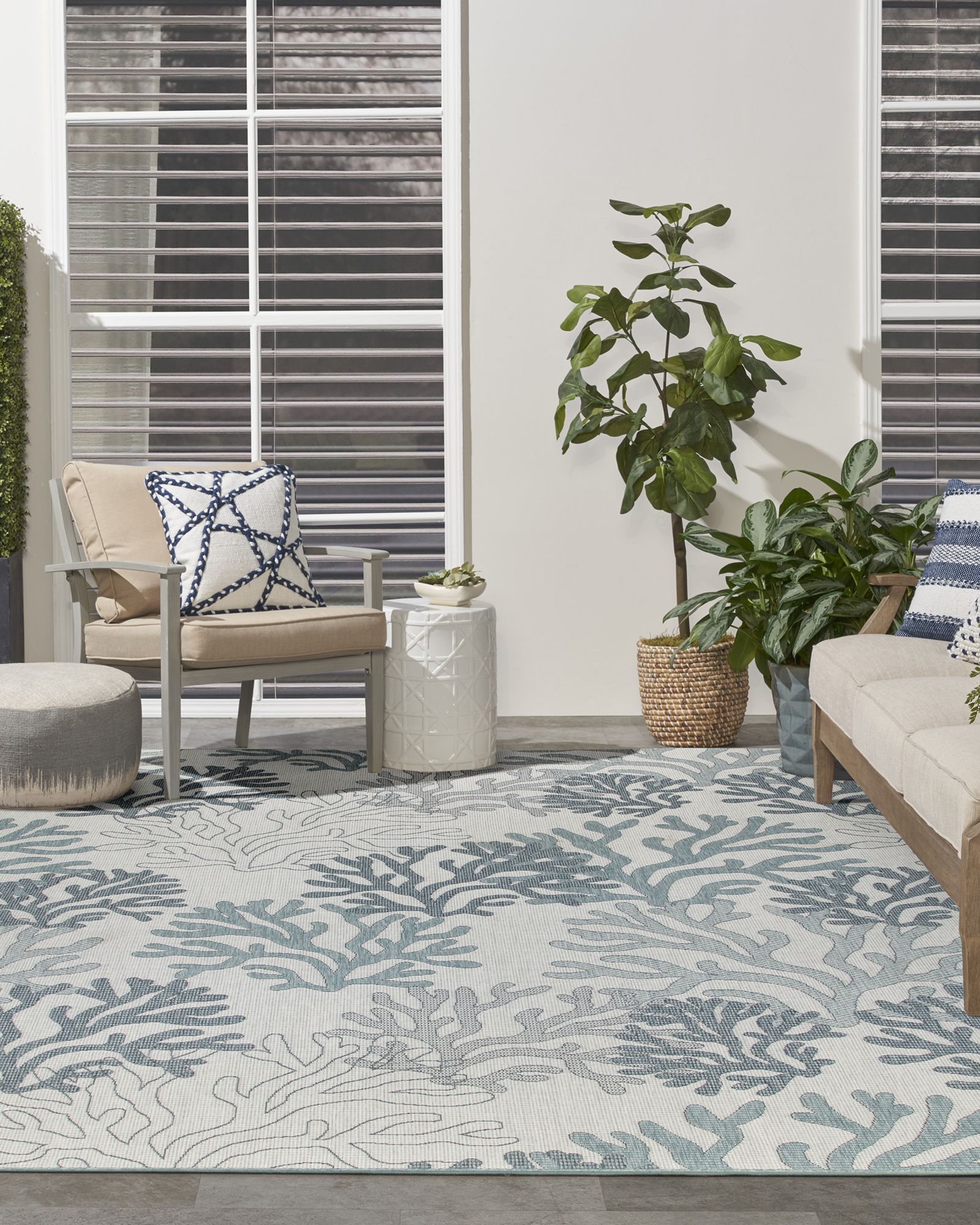 | Description | Tropical with a touch of modern, the Nourison Garden Oasis GOA05 Blue Area Rug Collection of outdoor rugs transforms any space into a breezy retreat. With a modern color palette and low-maintenance construction, these flat weave rugs are built for performance but don’t sacrifice style. The lightweight construction lays flat quickly and doesn’t shed, so you can spend less time waiting for your space to come together and get right to relaxing with friends and family. Bring the fun of undersea exploration home with this nautical outdoor rug from the Garden Oasis Collection. An oversized pattern of overlapping coral adds a delightful pop of pattern to both indoor and outdoor spaces. The durable polypropylene construction makes cleaning and maintenance a breeze. Hand washable outdoors only: rinse with a hose and air dry. |
