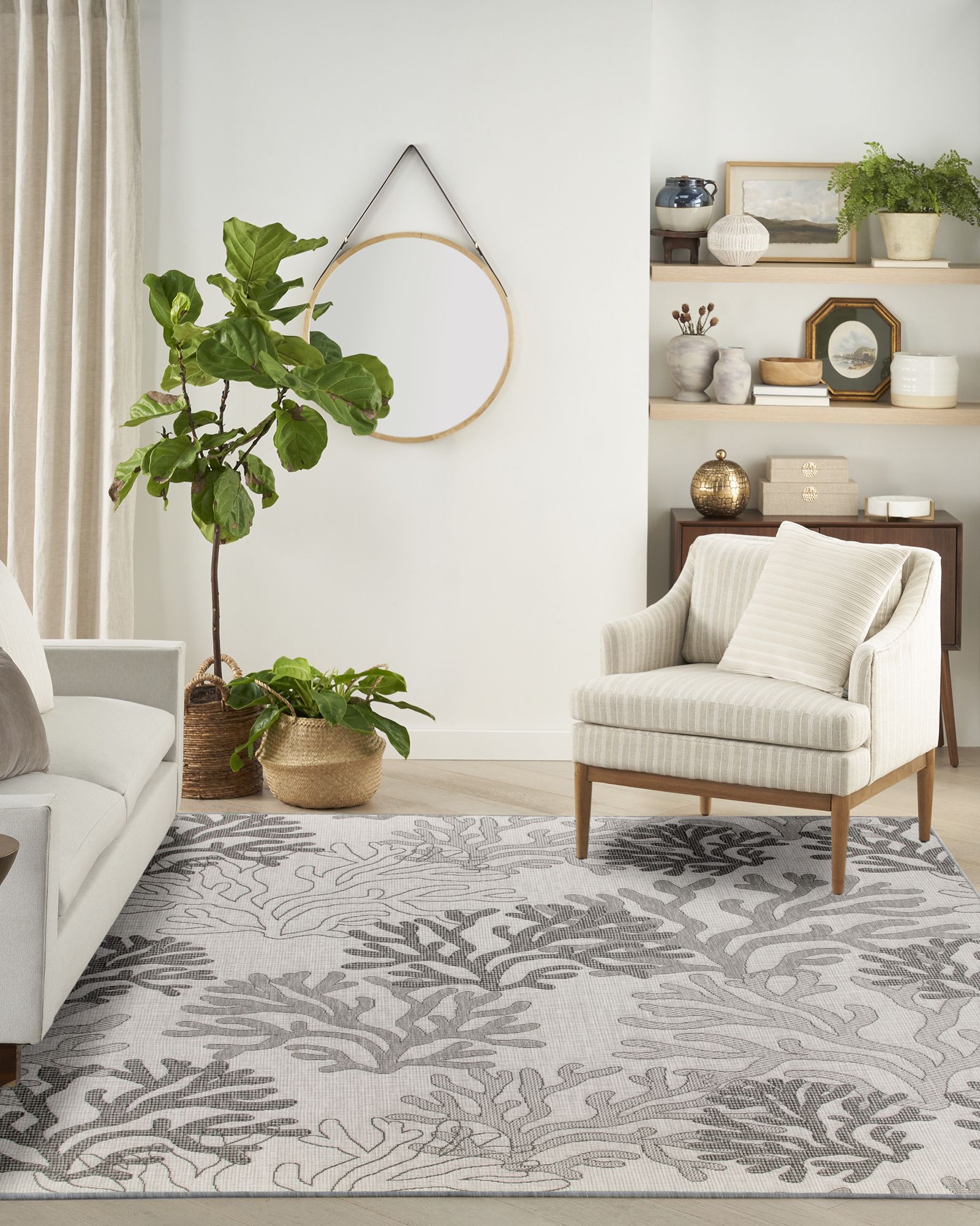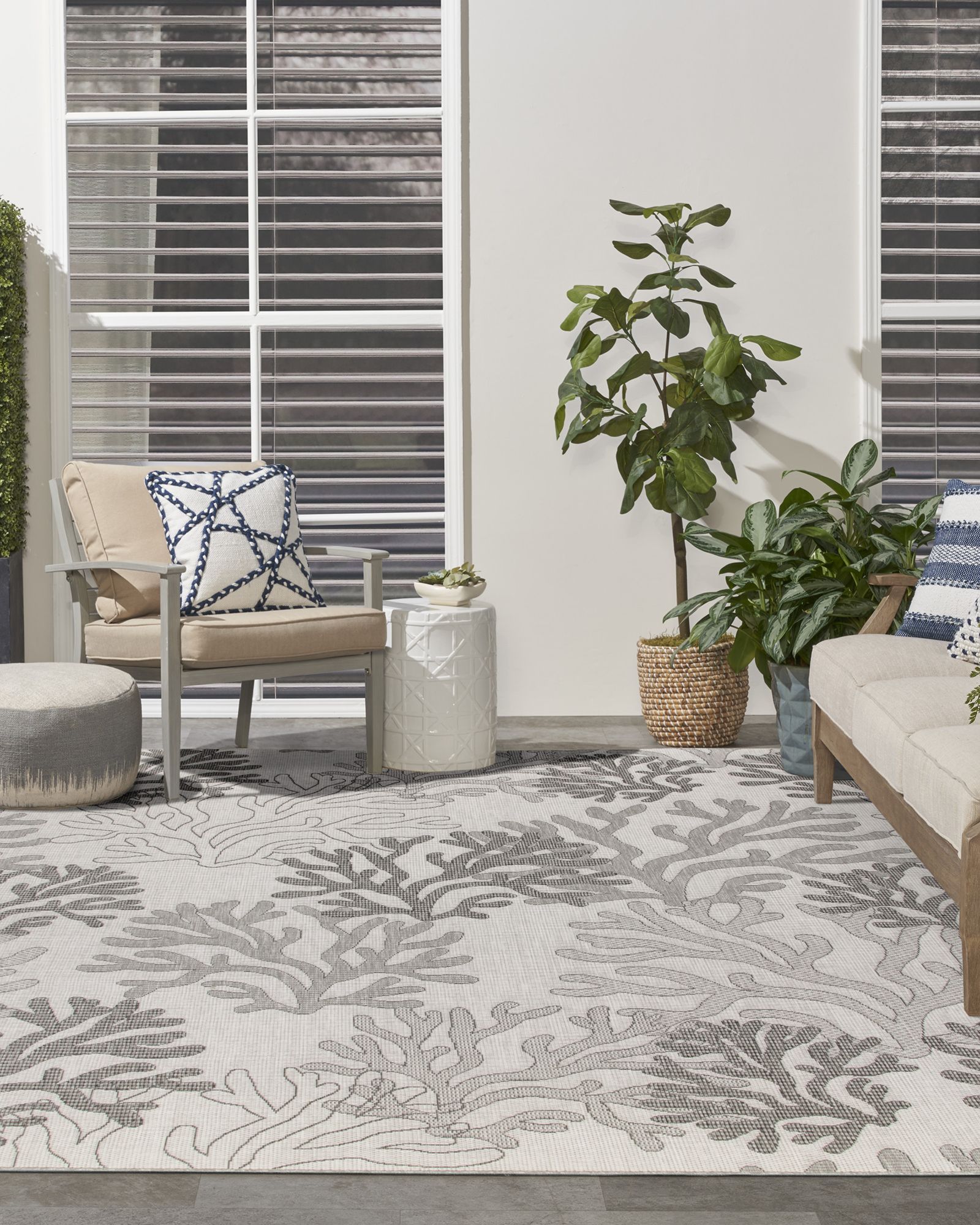 | Description | Tropical with a touch of modern, the Nourison Garden Oasis GOA05 Grey Area Rug Collection of outdoor rugs transforms any space into a breezy retreat. With a modern color palette and low-maintenance construction, these flat weave rugs are built for performance but don’t sacrifice style. The lightweight construction lays flat quickly and doesn’t shed, so you can spend less time waiting for your space to come together and get right to relaxing with friends and family. Bring the fun of undersea exploration home with this nautical outdoor rug from the Garden Oasis Collection. An oversized pattern of overlapping coral adds a delightful pop of pattern to both indoor and outdoor spaces. The durable polypropylene construction makes cleaning and maintenance a breeze. Hand washable outdoors only: rinse with a hose and air dry. |