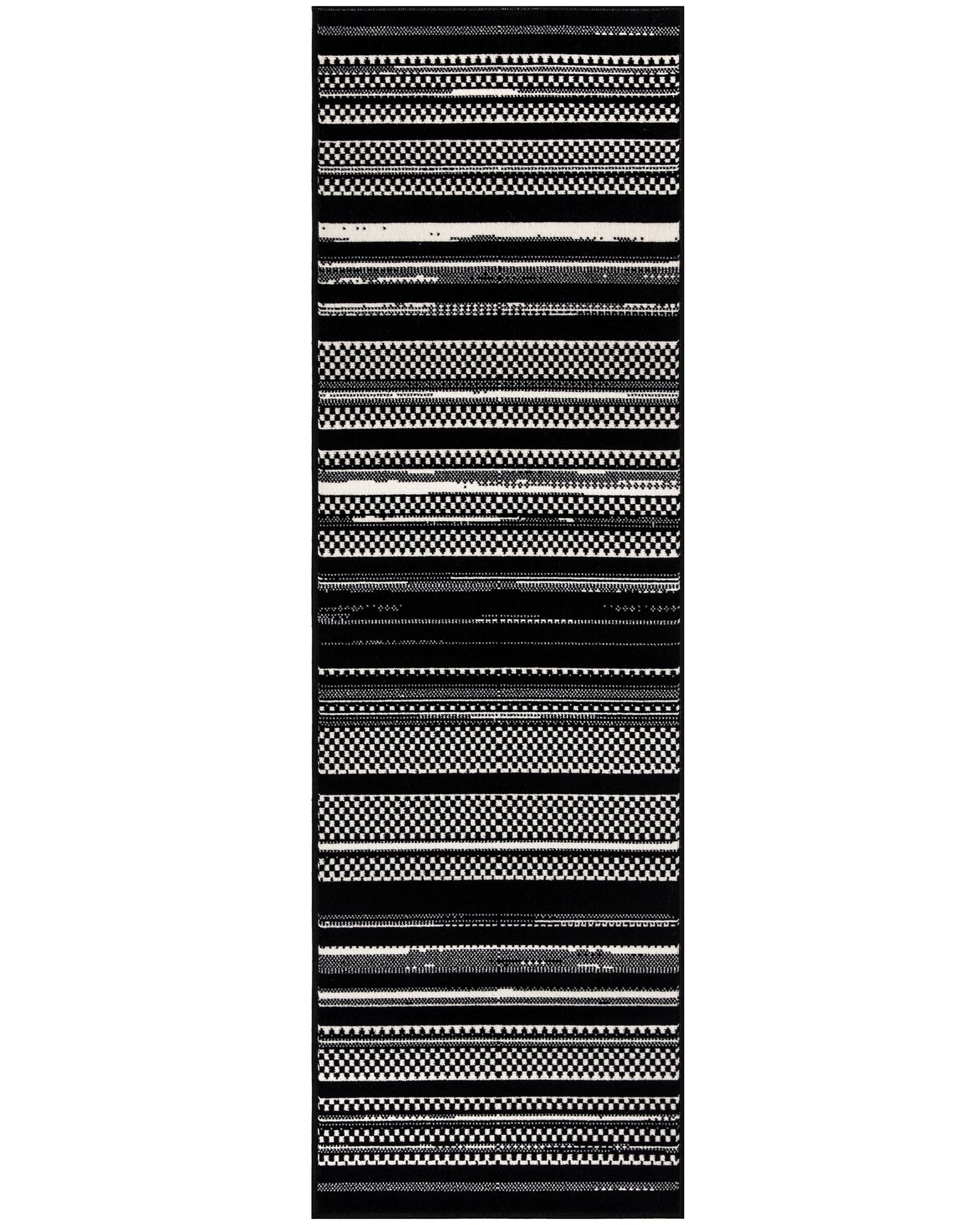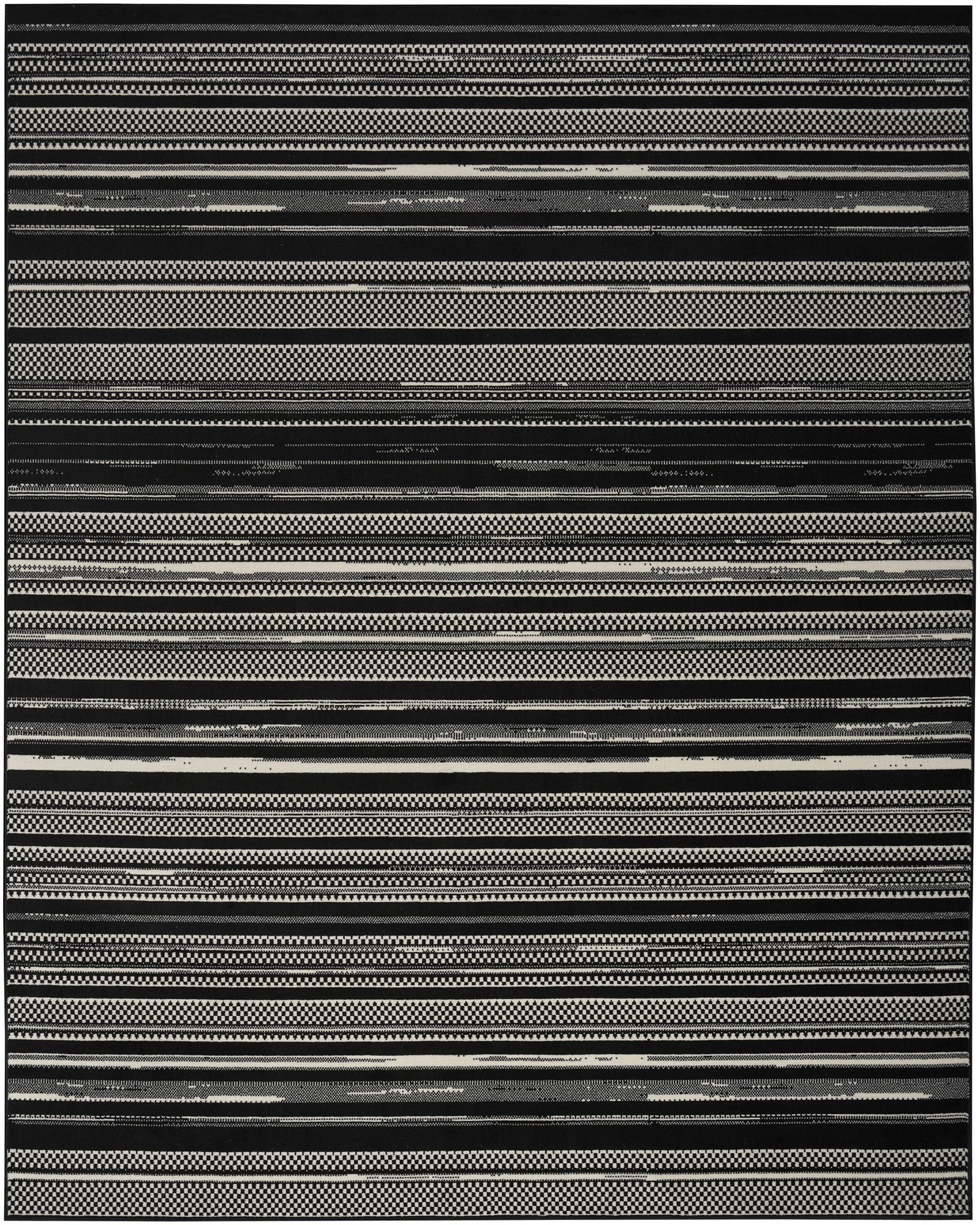 Beautifully bold and gorgeously graphic, the Grafix GRF41 Black White Collection of area rugs from Nourison is destined to deliver a transfixing touch of dramatic appeal to any room. Available in an enthralling array of contemporary color palettes and power-loomed from long-lasting, easy-care polypropylene, each exciting rug is all about outstanding ease and sensational style. For the modern maximalist, this abstract striped rug from the Grafix Collection adds bold pattern to your space. The combination of solid stripes, checkered blocks, and lightly distressed lines creates visual interest when added to your kitchen, entryway, bedroom, or living room decor. Machine-made from durable polypropylene yarns that are easy to maintain – great for busy households with pets, young kids, and frequent guests.