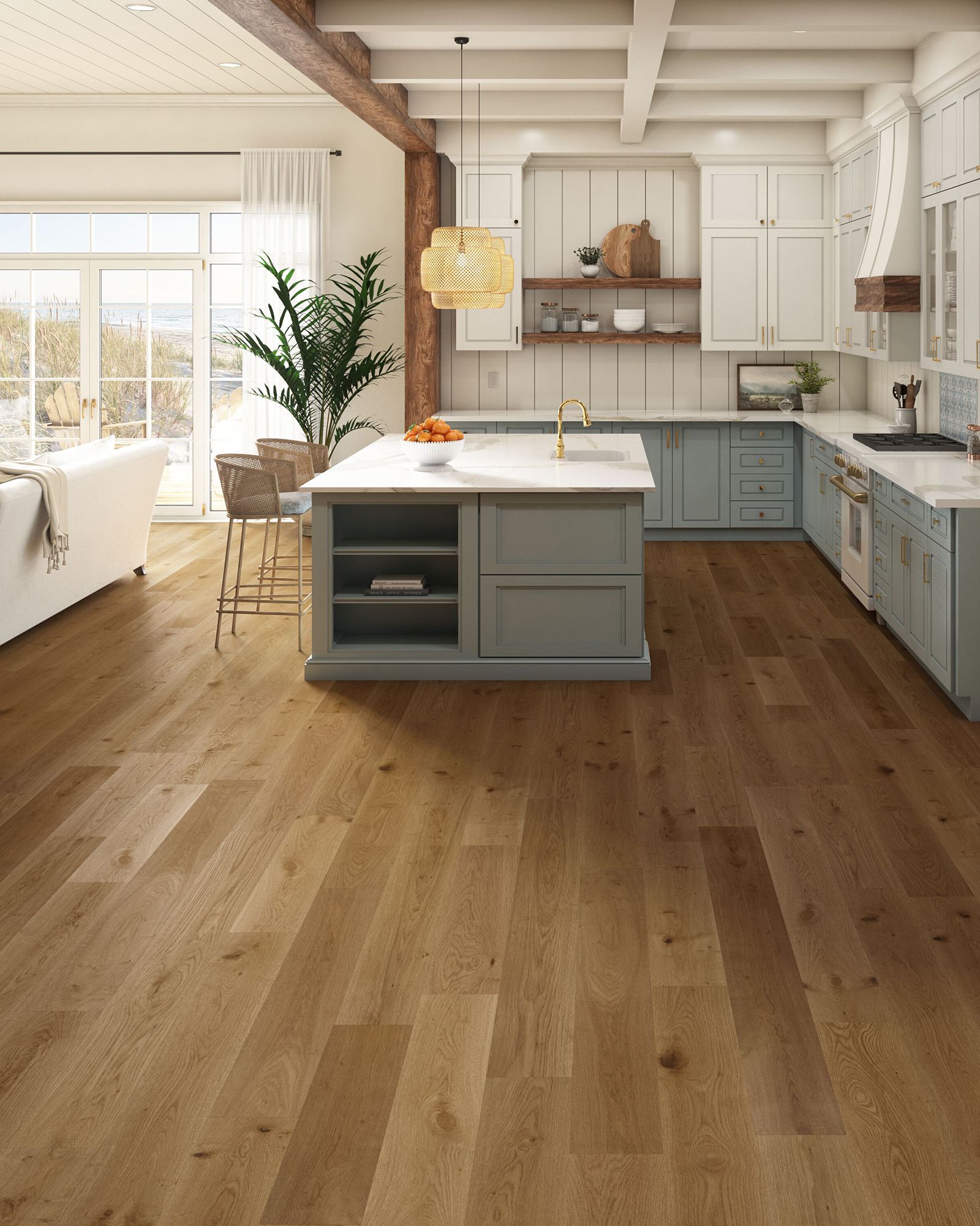 The Robbins Coastside Secret Beach White Oak 7.5" Hardwood Collection brings timeless coastal elegance to your home with wire-brushed white oak planks. Crafted with engineered hardwood construction and a durable low-gloss urethane aluminum oxide finish, these floors combine natural beauty with lasting protection. Each 7.5in wide plank features micro-beveled edges and varying lengths up to 75.8in for a refined, modern look. With moderate light sensitivity and a lifetime residential warranty, Coastside floors are built for style and performance. Multiple installation methodsāfloating, glue, or stapleāprovide flexibility for any project, while the strong 5/8in thickness ensures durability. Backed by a 10-year commercial warranty, the Coastside Collection offers lasting value and effortless sophistication.