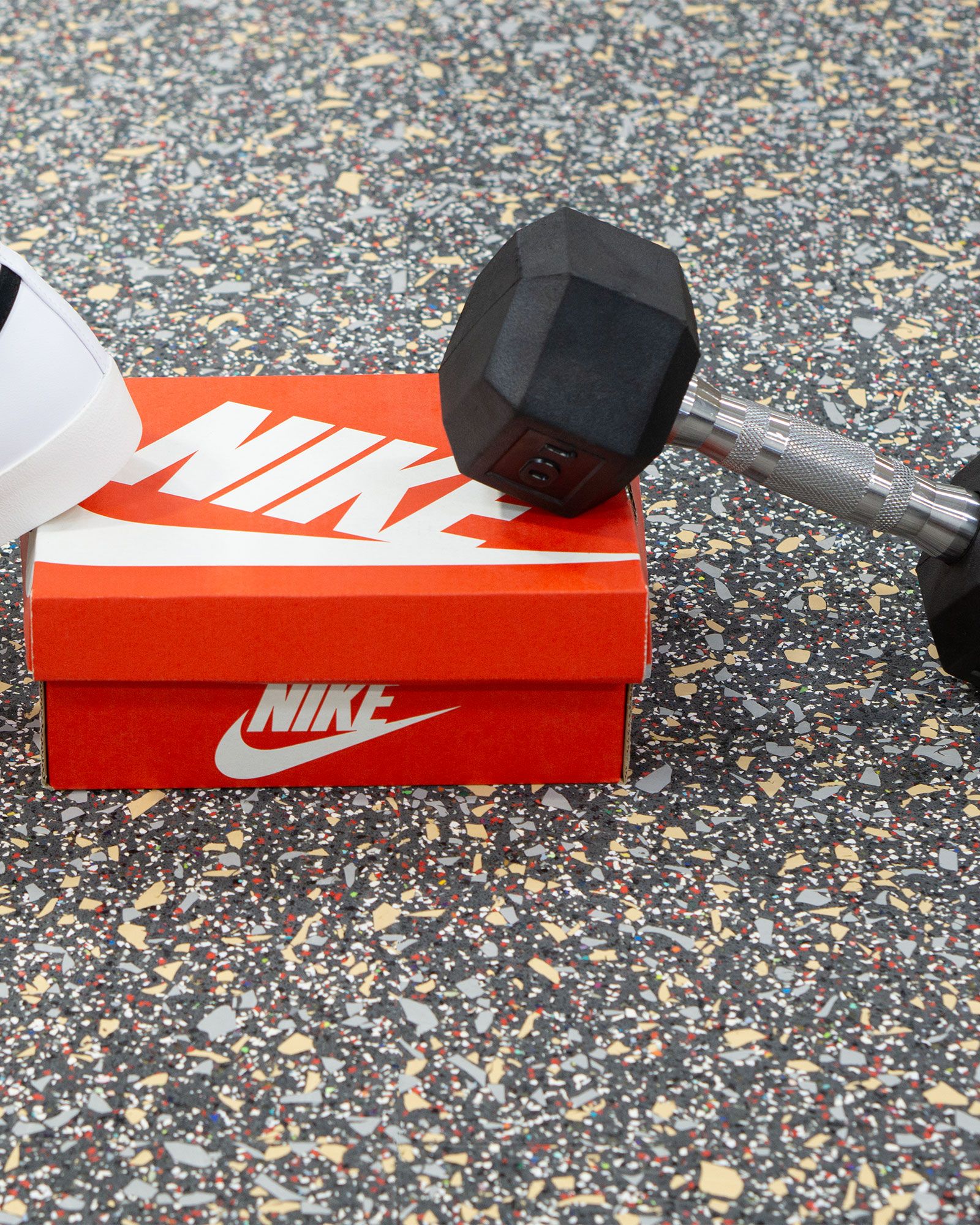 The Hero Rubber + Nike Grind Dunk Primal Collection delivers high performance materials with recycled rubber made from post-consumer athletic shoes. It has a 20% construction made from Nike Grind and is crafted without recycled tires or crumb rubber, making it a super clean product. This rubber flooring is approved for areas with free weights when using 8mm thickness or greater. It's available in square tiles and interlocking tiles.