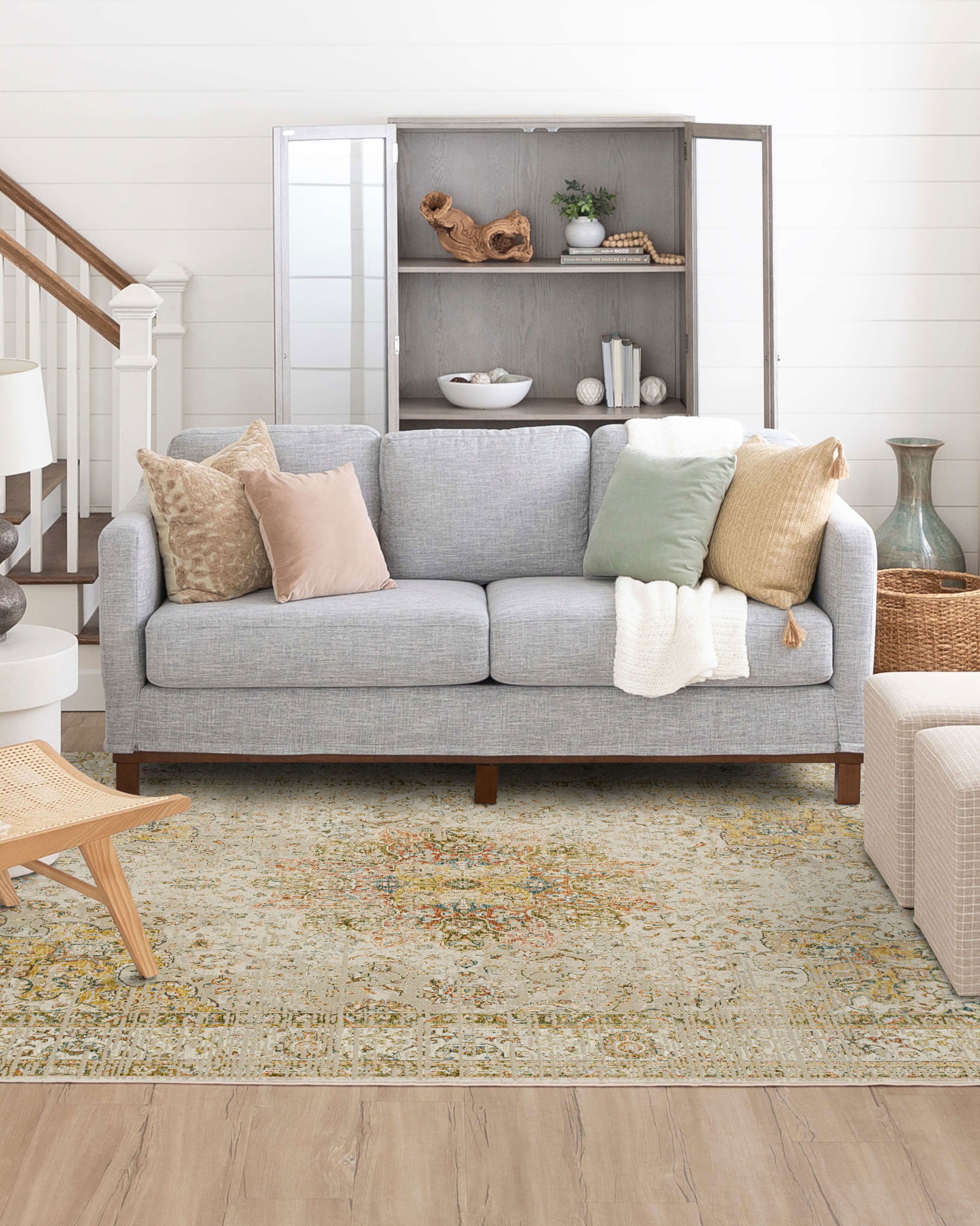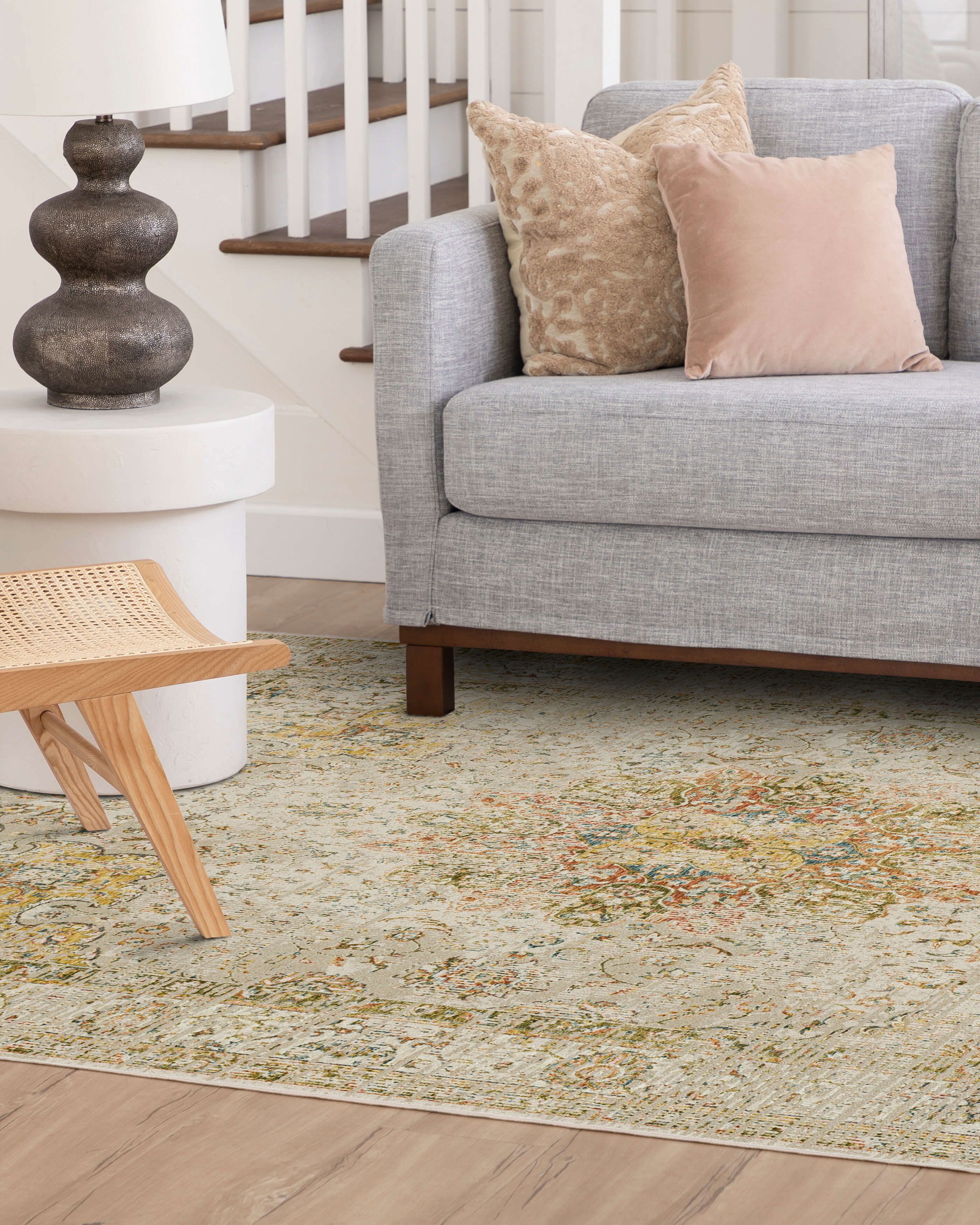 | Description | This stunning Memento Keepsake Cream Collection by Karastan Rugs is the perfect statement of sophistication for any room in the home. Its velvety cut pile is highly textural and richly colored in a modern palette of sand splashed with olive green, rust red, grey, ivory and gold. Space dyed, 8MM pile height with an assortment of distressed designs to choose from including ornate and wispy clouds of cross-hatched linear pattern. |