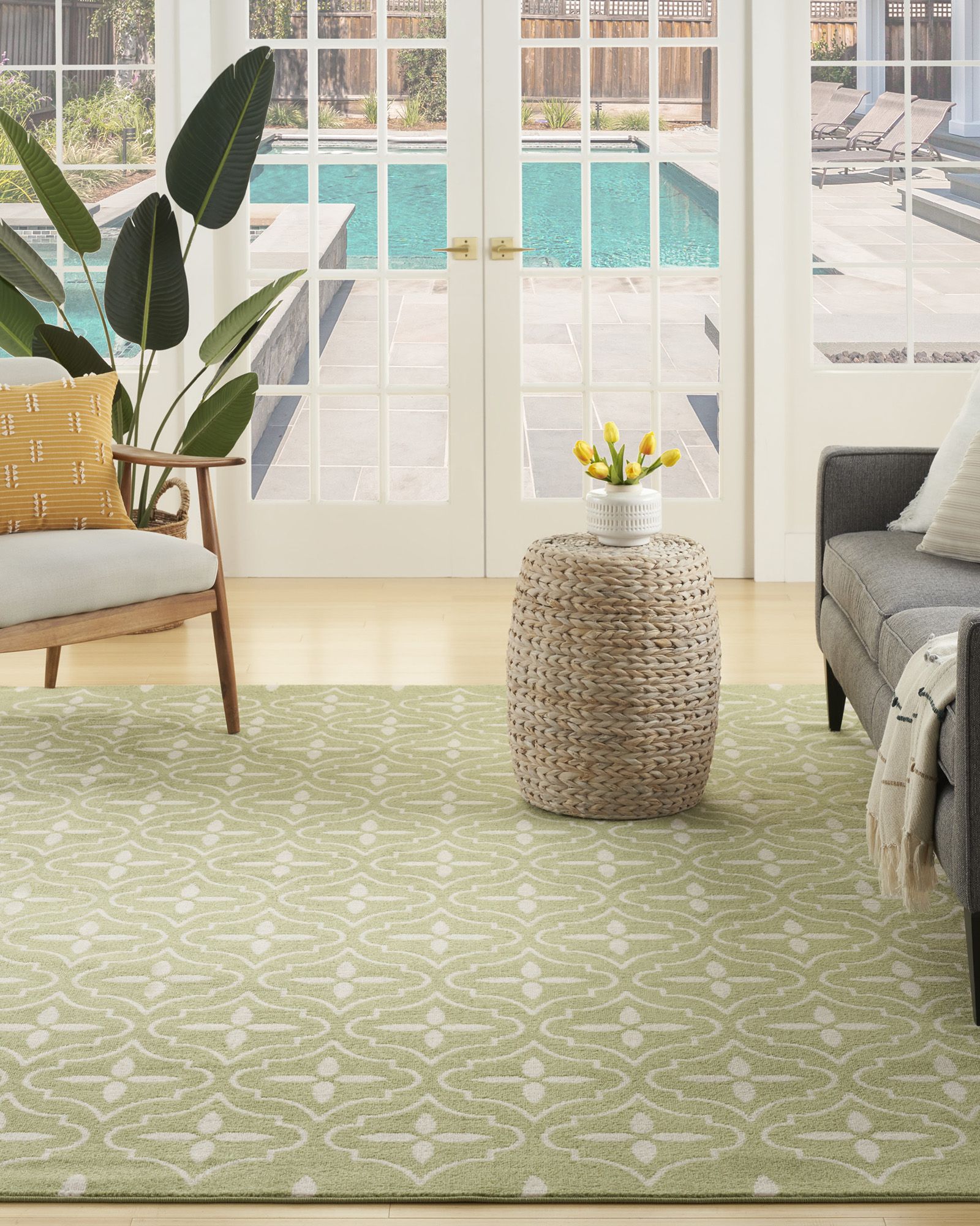 Busy, active lifestyles demand fuss-free decor, and this outdoor rug collection has it all. Nourison Essentials NRE04 Green Ivory area rugs give you everything you want, and more! These handsome, solid color and patterned area rugs are crafted for rugged performance, but never sacrifice style for function. With a low cut pile, each Essentials rug is designed to withstand heavy traffic, including kids and pets. You'll appreciate the durability, easy care, and soft texture of this contemporary rug collection in a wide range of colors and sizes to fit every indoor and outdoor space. Ideal for your porch, patio, balcony, poolside and deck, or living room, dining room, and other gathering places. 100% polypropylene fibers can be vacuumed, hose-rinsed and air-dried. For even longer life, bring indoors during extreme weather.