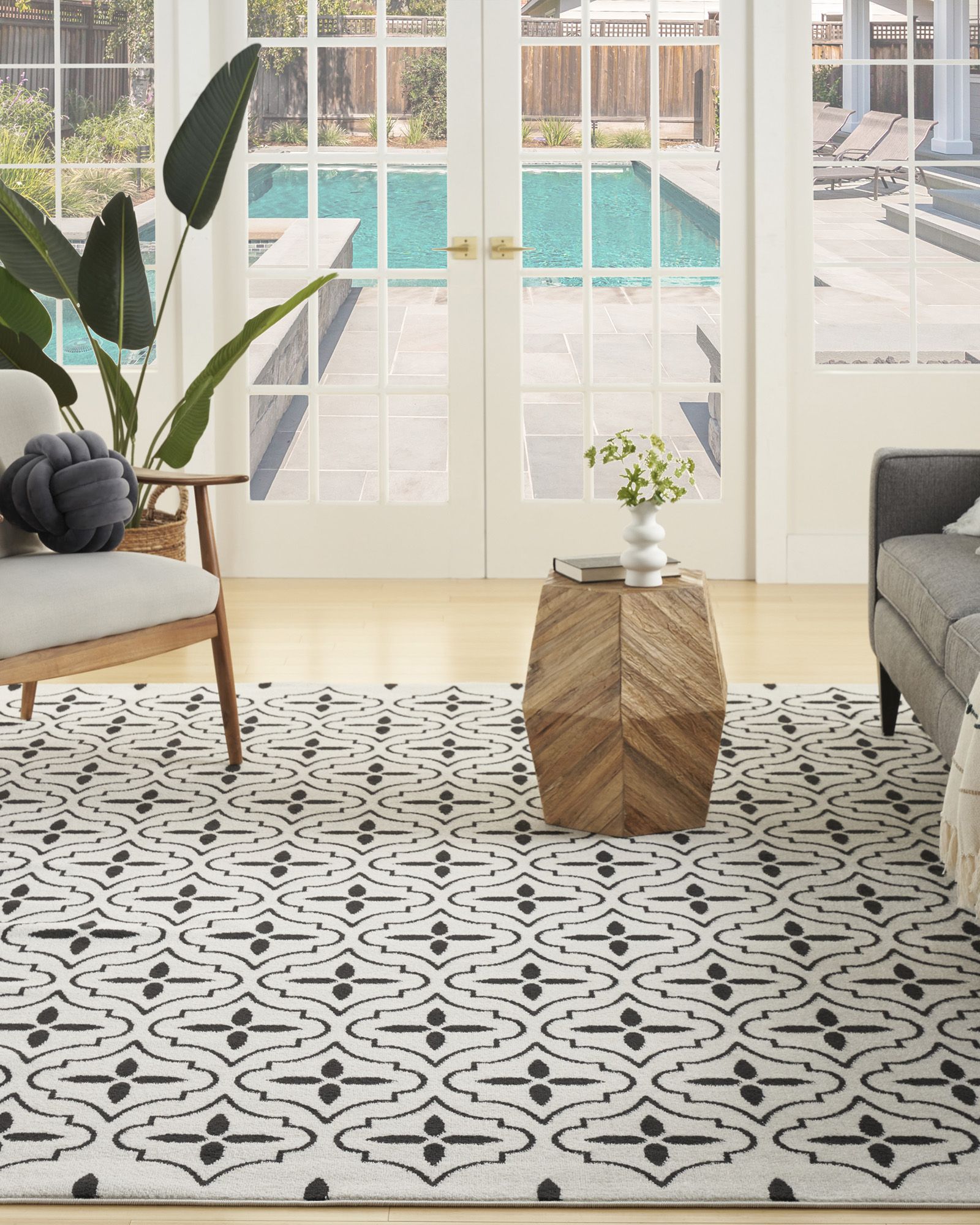 Busy, active lifestyles demand fuss-free decor, and this outdoor rug collection has it all. Nourison Essentials NRE04 Ivory Black area rugs give you everything you want, and more! These handsome, solid color and patterned area rugs are crafted for rugged performance, but never sacrifice style for function. With a low cut pile, each Essentials rug is designed to withstand heavy traffic, including kids and pets. You'll appreciate the durability, easy care, and soft texture of this contemporary rug collection in a wide range of colors and sizes to fit every indoor and outdoor space. Ideal for your porch, patio, balcony, poolside and deck, or living room, dining room, and other gathering places. 100% polypropylene fibers can be vacuumed, hose-rinsed and air-dried. For even longer life, bring indoors during extreme weather.