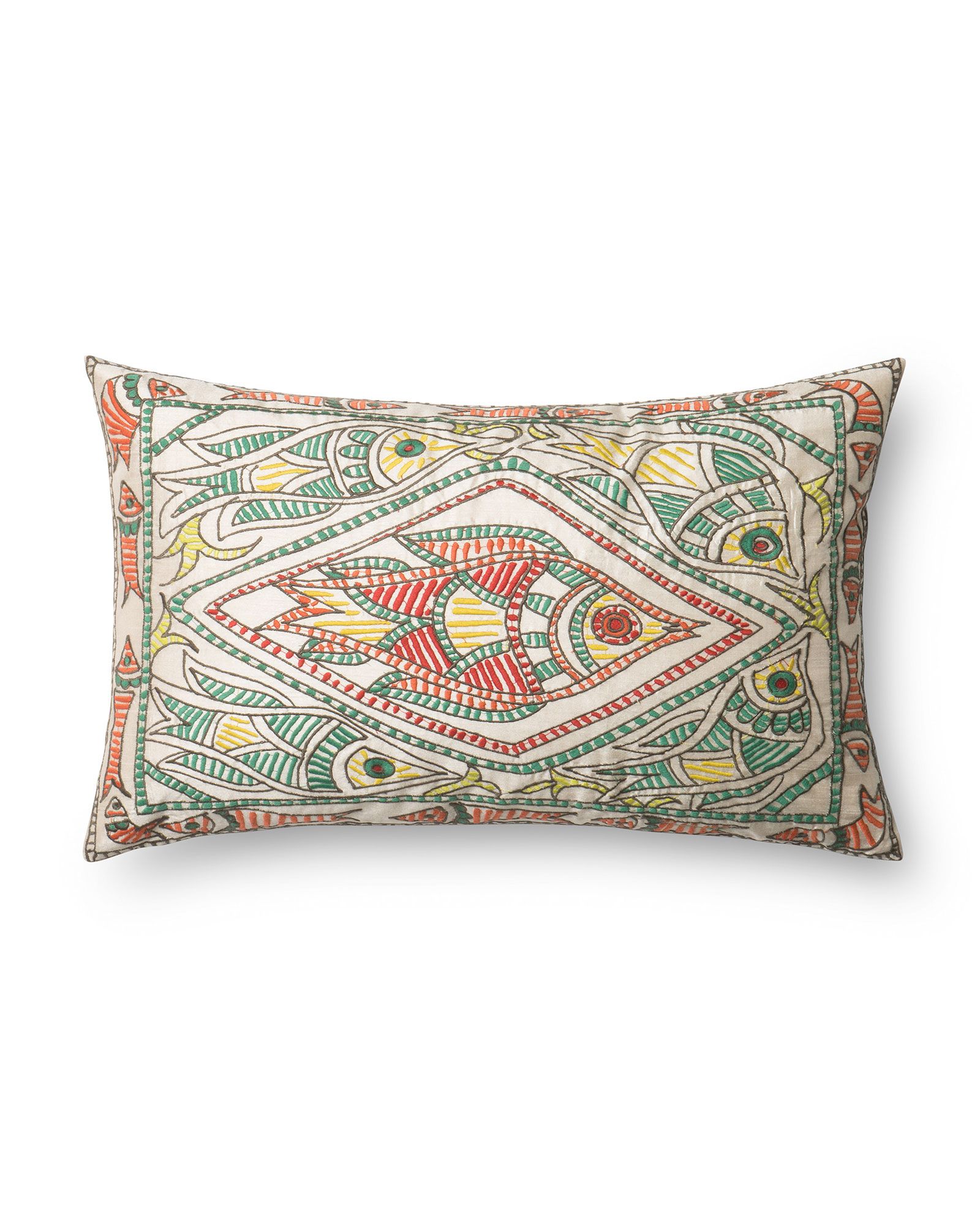 | Description | The Loloi P0314 Multi 13"x21" Pillow features a bohemian fish motif design in hues of green and red. |