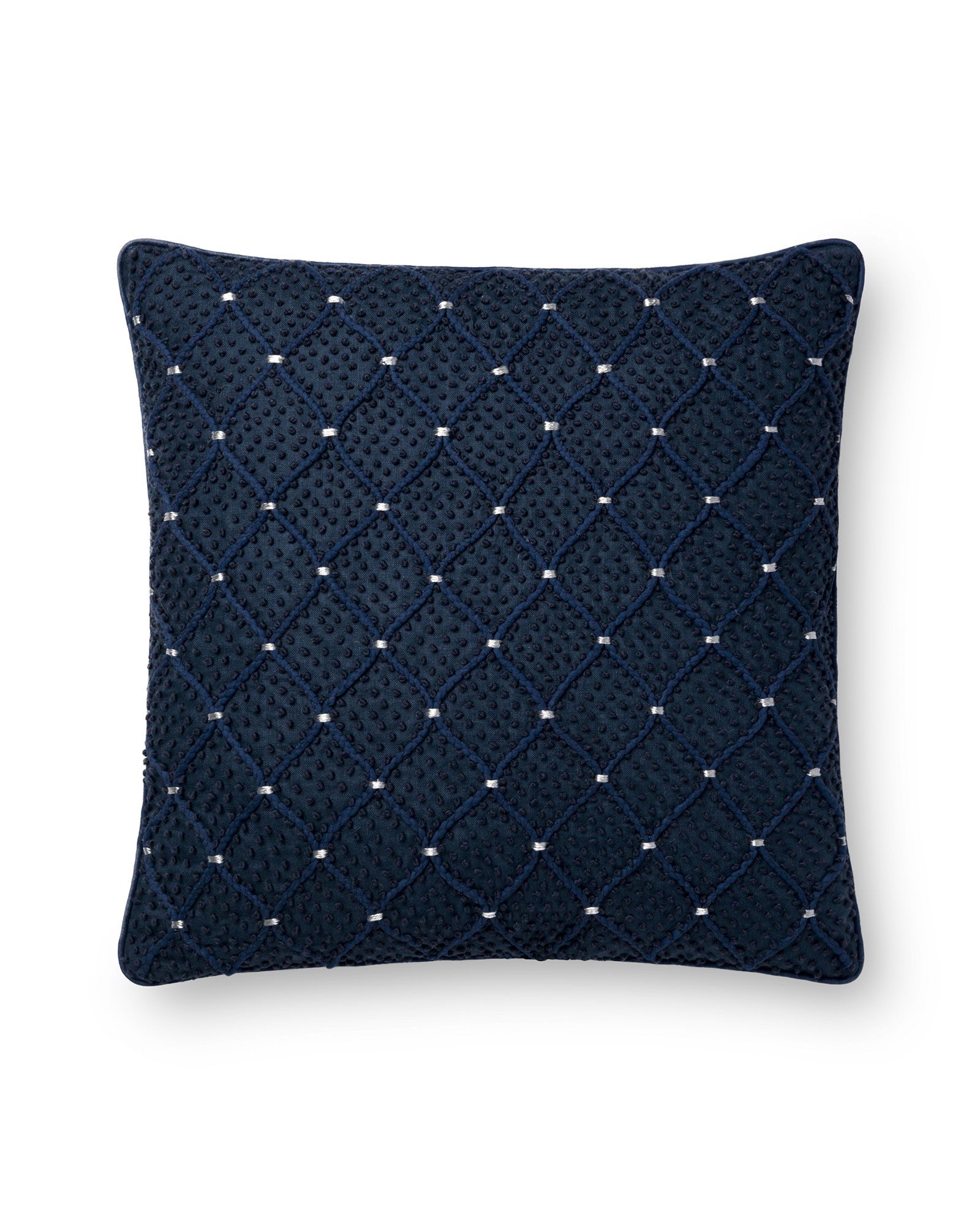 | Description | The Loloi P0675 Navy/Silver 18"x18" Pillow features a quilted lattice design with beaded embellished detailing in a navy blue color. |