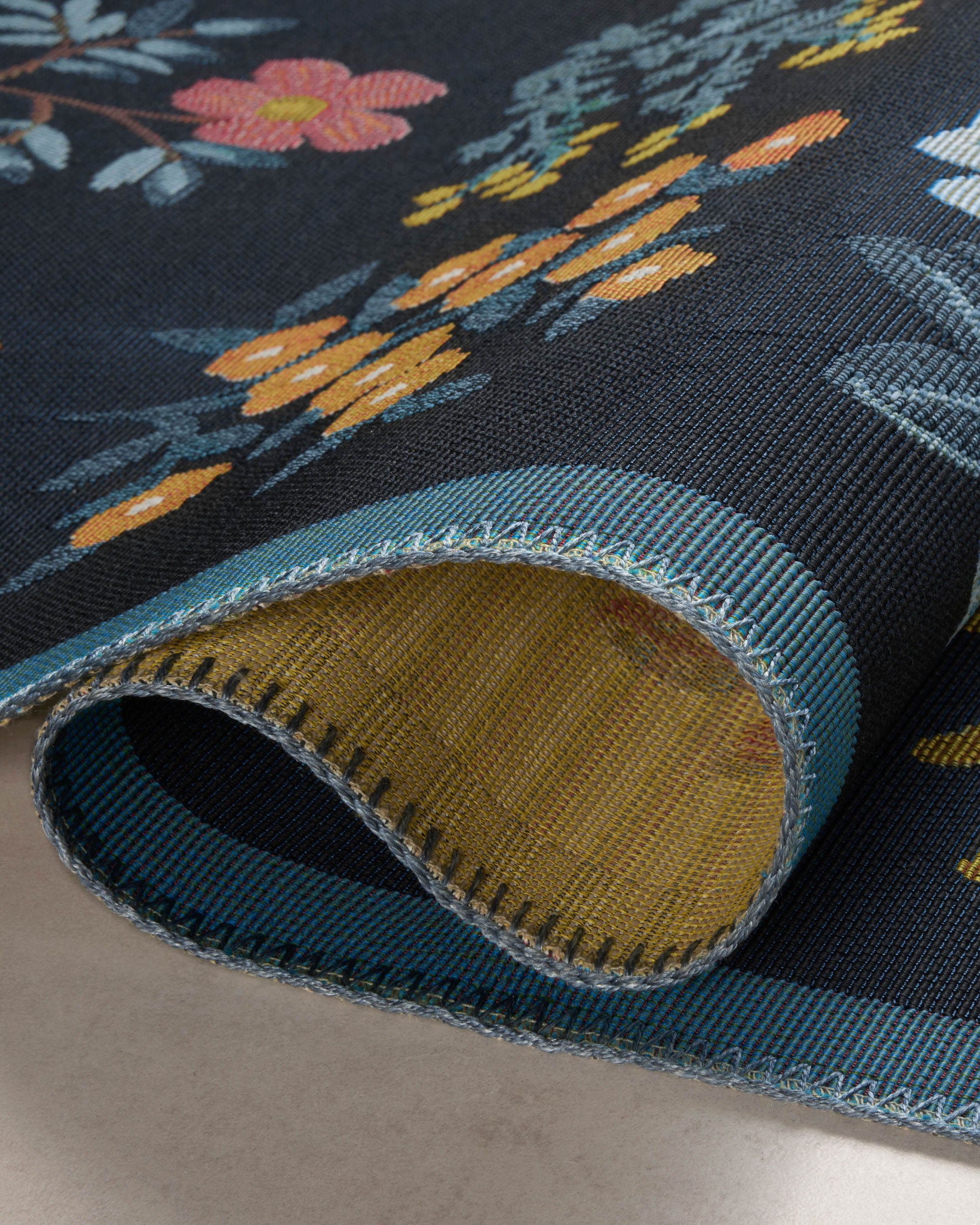 The Perennial PRN-03 Black Area Rug Collection is the first outdoor area rug from Rifle Paper Co. x Loloi. Signature florals in bold, vibrant palettes make each rug a standout whether it’s styled indoors or out, on patios or in mudrooms, hallways, or playrooms. The rug is power-loomed of polypropylene and polyester for durability and weather resistance, simply hose off and air-dry when needed. Made in Egypt. This collection is OEKO-TEX certified, ensuring its materials don't contain harmful substances.