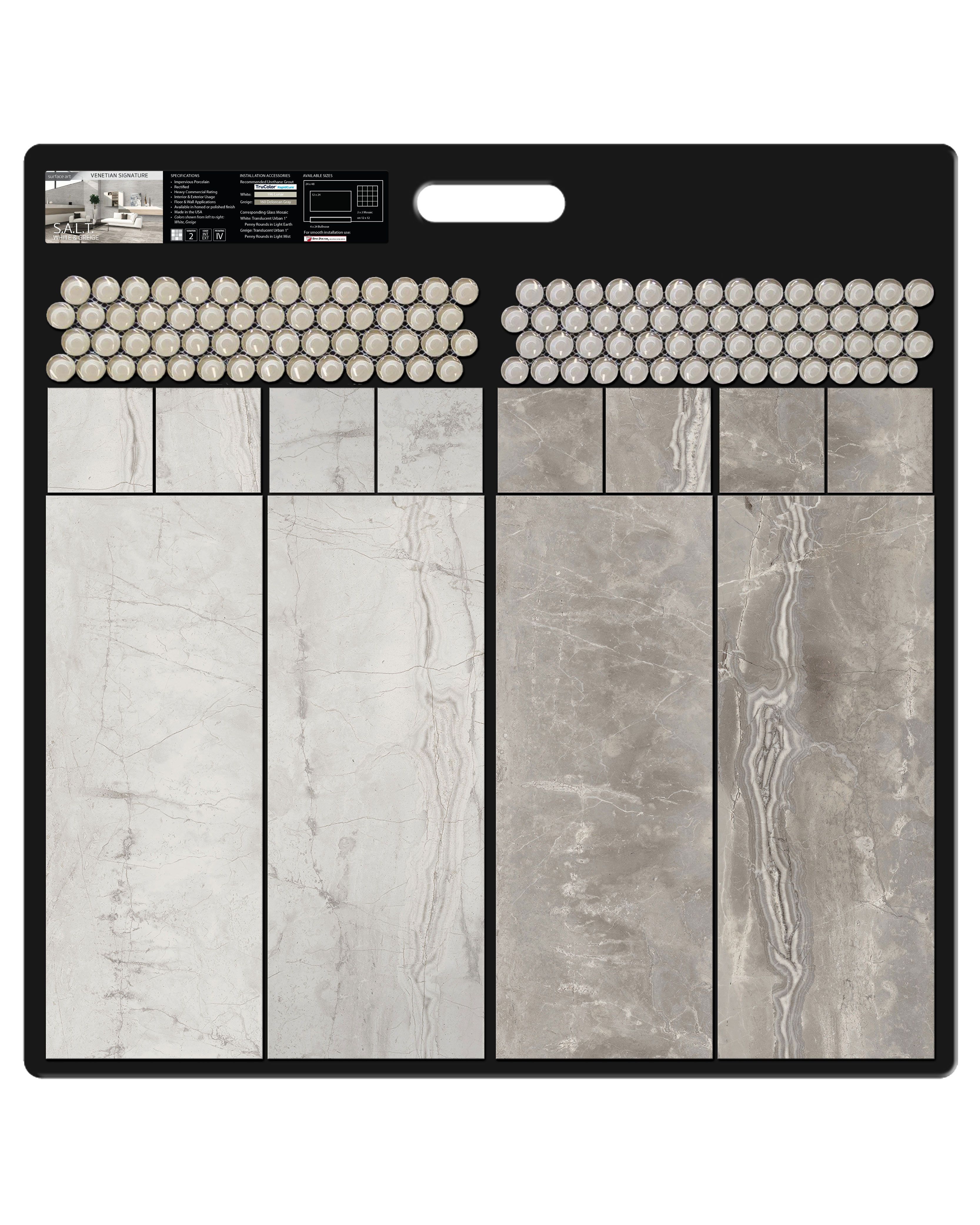 | Description | The Surface Art S.A.L.T. Greige Tile Collection features a marble look, honed and polished finishes, porcelain body, rectified edge, and is made in the USA. Product Installation - Wall/Floor. Substantial random variation in patterns and colors between tiles. Suitable for moderate to heavy traffic. This tile is freeze resistant, stain resistant, and has a commercial rating. |