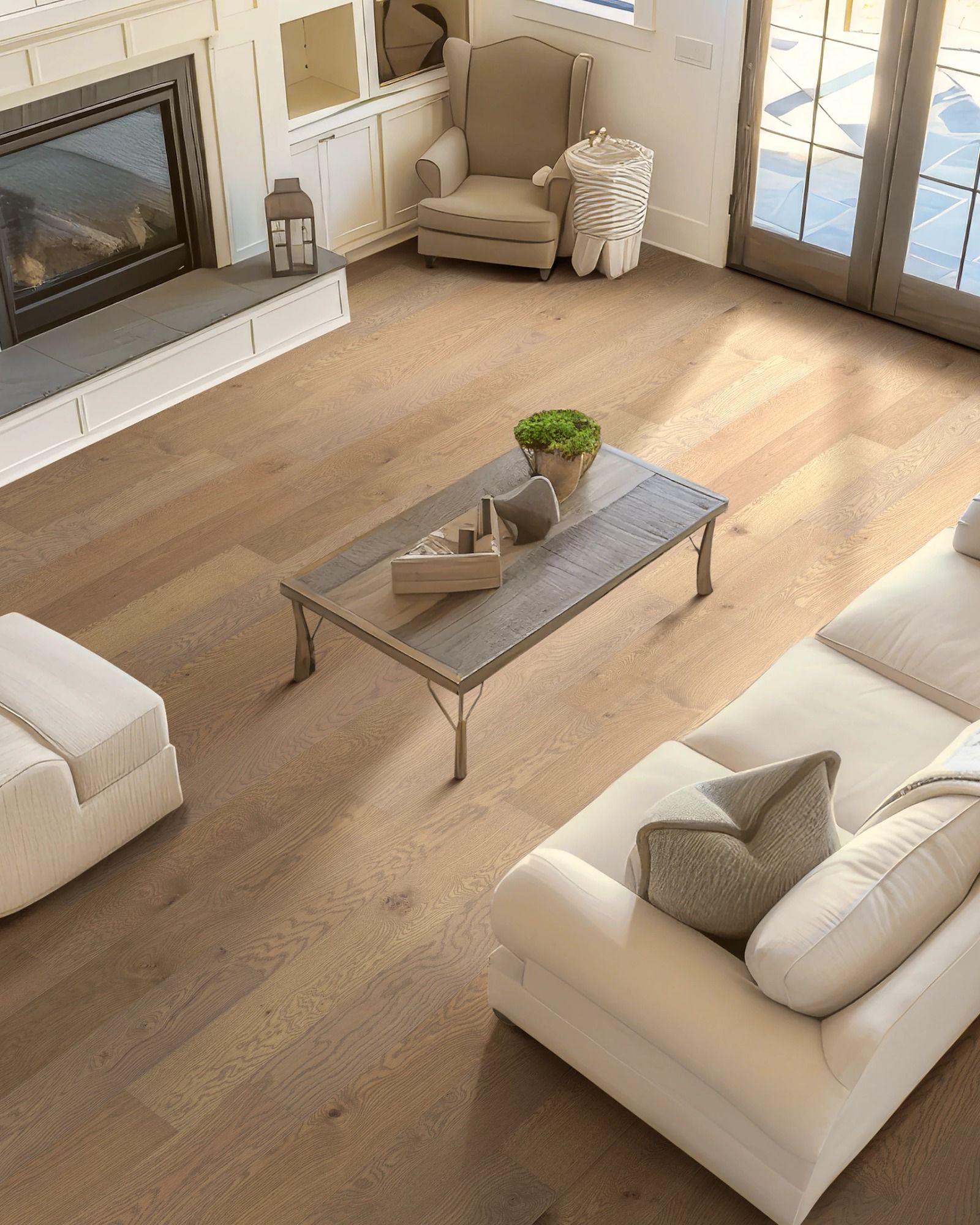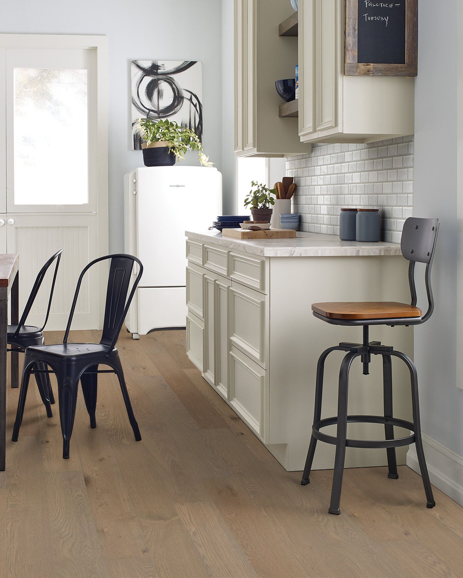 The Shaw Americana Oak Legacy 7" Hardwood Collection features engineered white planks with a wirebrushed surface texture and pillowed edges. It features the Repel Water Resist finish which creates a more durable floor that can handle mess and spills. It can be installed using a variety of methods including nail, staple, glue or floating. It's finished with a lifetime residential warranty.