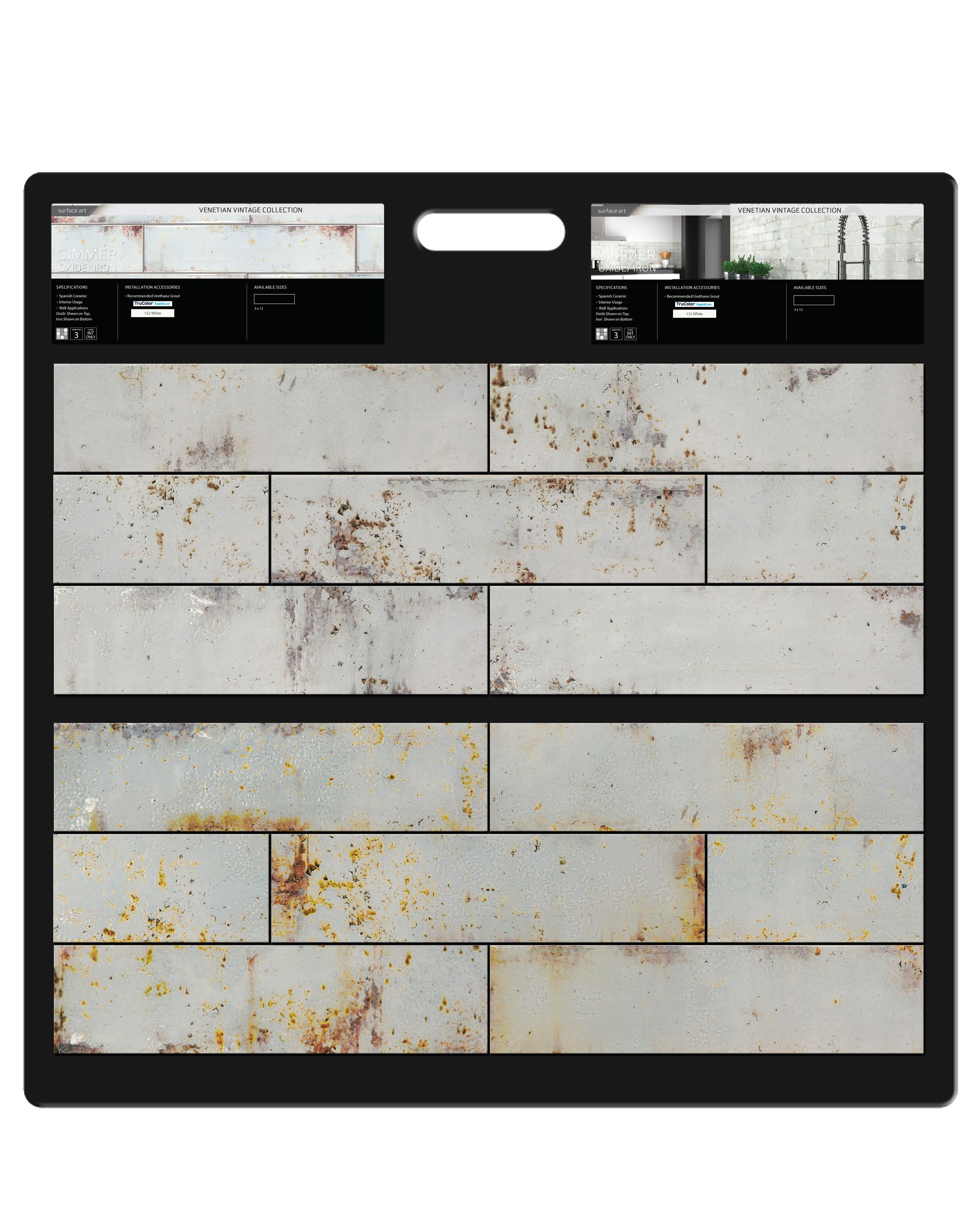 | Description | The Surface Art Simmer Oxide Tile Collection features a metallic look, glossy finish, ceramic body, pressed edge, and is made in Spain. Wall installation only. Moderate and significant variation in patterns and/or colors between tiles. This tile is freeze resistant, stain resistant, and has a commercial rating. |