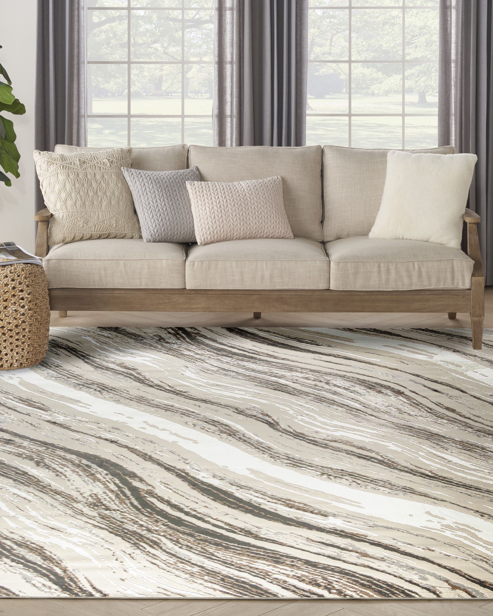 Sustainability meets sophisticated style with the Nourison Sustainable Trends SUT05 Beige Grey Area Rug Collection. These modern rugs are woven with recycled polyester yarns that are not only easy to clean but are incredibly soft to the touch. Choose from a range of abstract designs with subtly raised textural accents, available in cozy neutrals that easily complement your furniture without overpowering. Equal parts modern and refined, this abstract rug from the Sustainable Trends Collection grounds your space in eco-friendly style. Woven with recycled polyester yarns, this softly textured rug is ultra-durable for fuss-free cleaning and lasting style. Available in a variety of sizes – from runners to large rugs – for easy coordination between your living room, hallway, bedroom, or kitchen decor.