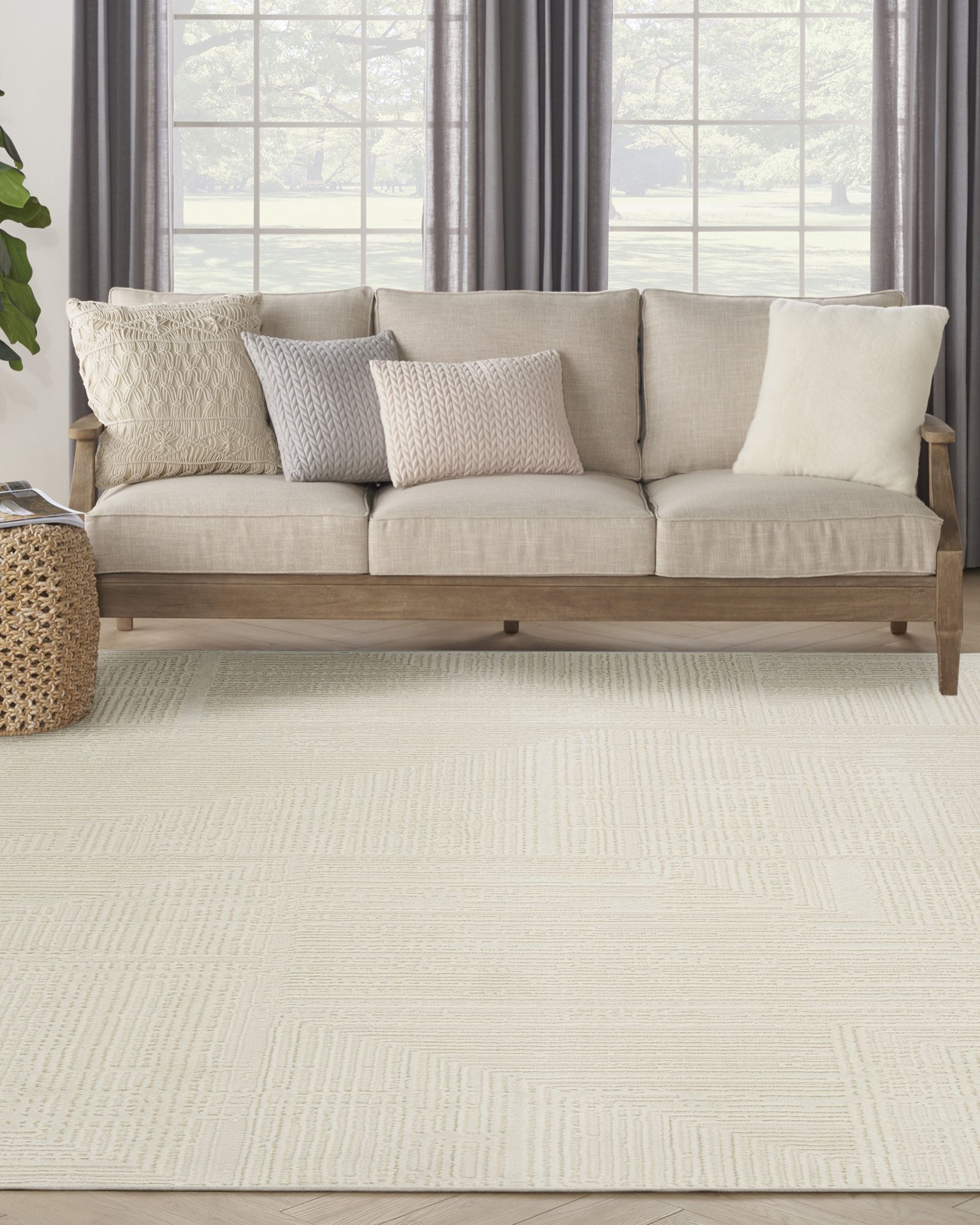 Sustainability meets sophisticated style with the Nourison Sustainable Trends SUT07 Ivory Area Rug Collection. These modern rugs are woven with recycled polyester yarns that are not only easy to clean but are incredibly soft to the touch. Choose from a range of abstract designs with subtly raised textural accents, available in cozy neutrals that easily complement your furniture without overpowering. Equal parts modern and refined, this abstract rug from the Sustainable Trends Collection grounds your space in eco-friendly style. Woven with recycled polyester yarns, this softly textured rug is ultra-durable for fuss-free cleaning and lasting style. Available in a variety of sizes – from runners to large rugs – for easy coordination between your living room, hallway, bedroom, or kitchen decor.