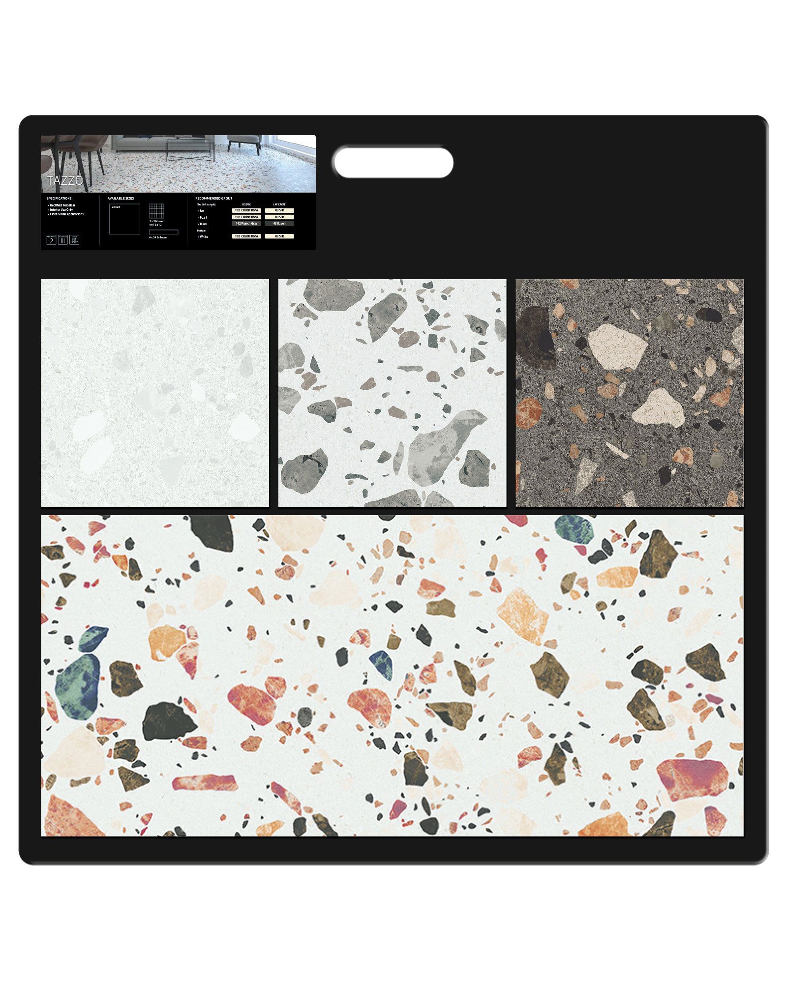 | Description | The Surface Art Tazzo Ice Tile Collection features a terrazzo look, honed finish, porcelain body, rectified edge, and is made in Spain. Product Installation - Wall/Floor. Slight variation in texture and/or patterns between tiles but similar color schemes. This tile is freeze resistant, stain resistant, and has a commercial rating. |
