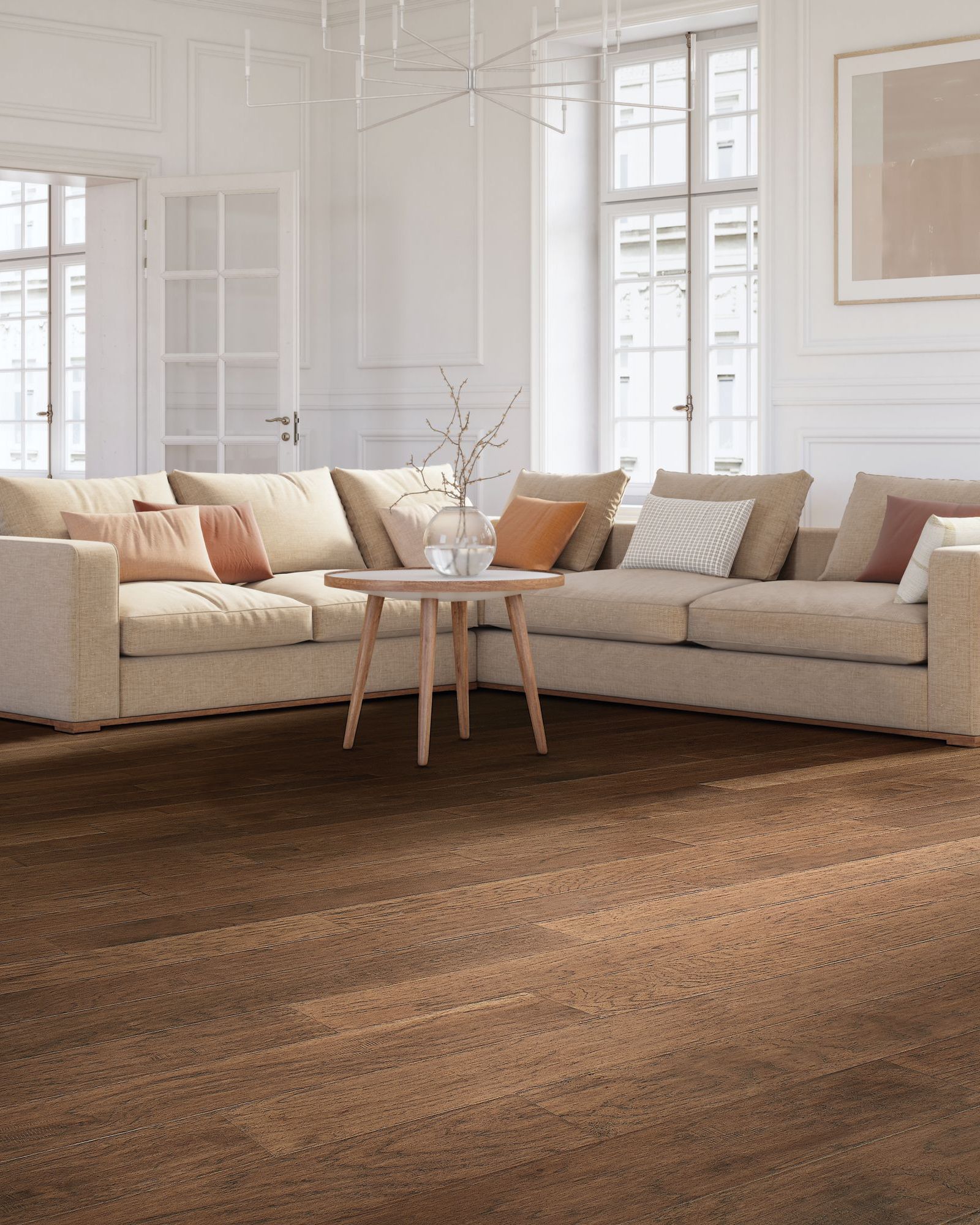 The Mohawk TecWood Essentials Whistlowe Coffee Hickory 6.5" Hardwood flooring combines timeless beauty with durability. Featuring 6.5in wide planks in random lengths up to 48in, this flooring is crafted with a 3/8in thickness and a strong 1.75mm rotary-cut veneer. Its pillowed and rolled edges create a smooth, refined look, while the aluminum oxide finish ensures long-lasting protection. With high hardness, low photosensitivity, and high shade variation, Whistlowe offers both style and resilience. Designed for versatile installation over wood or concrete subfloors using staple, glue, or float methods, it’s backed by a 25-year limited finish warranty and a 5-year light commercial warranty, making it a dependable choice for any space.