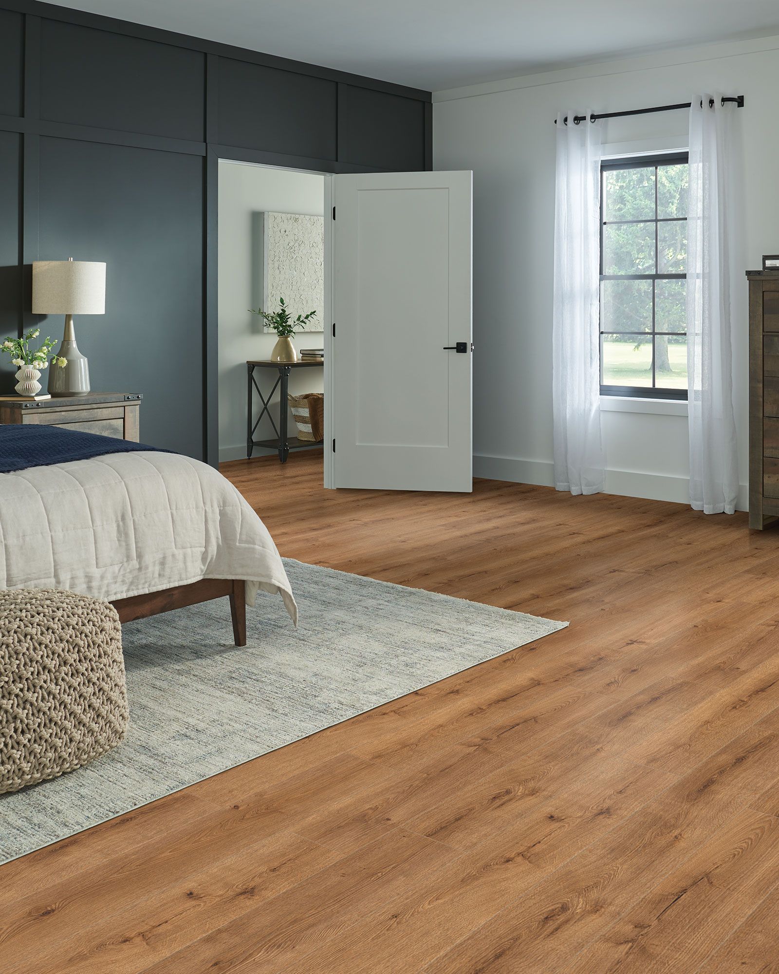 The Robbins TimberTru Pacific Path Appealing Warmth 8"x47" Waterproof Laminate flooring collection combines coastal-inspired design with long-lasting performance. Featuring realistic wood grain visuals, these wide-plank floors capture the natural beauty of shoreline landscapes while delivering modern durability. Each plank showcases authentic embossed texture and painted micro-beveled edges for a refined hardwood look. Engineered with a durable AC4 wear layer, TimberTru flooring is scratch, dent, and fade resistant, making it ideal for active households and light commercial spaces. Backed by a Limited Lifetime Waterproof Residential Warranty, this 100% waterproof flooring installs easily on any level, including basements and bathrooms, using a secure locking system. Made in the USA with U.S. and global components, this waterproof flooo offers dependable performance, coastal style, and long-term value.