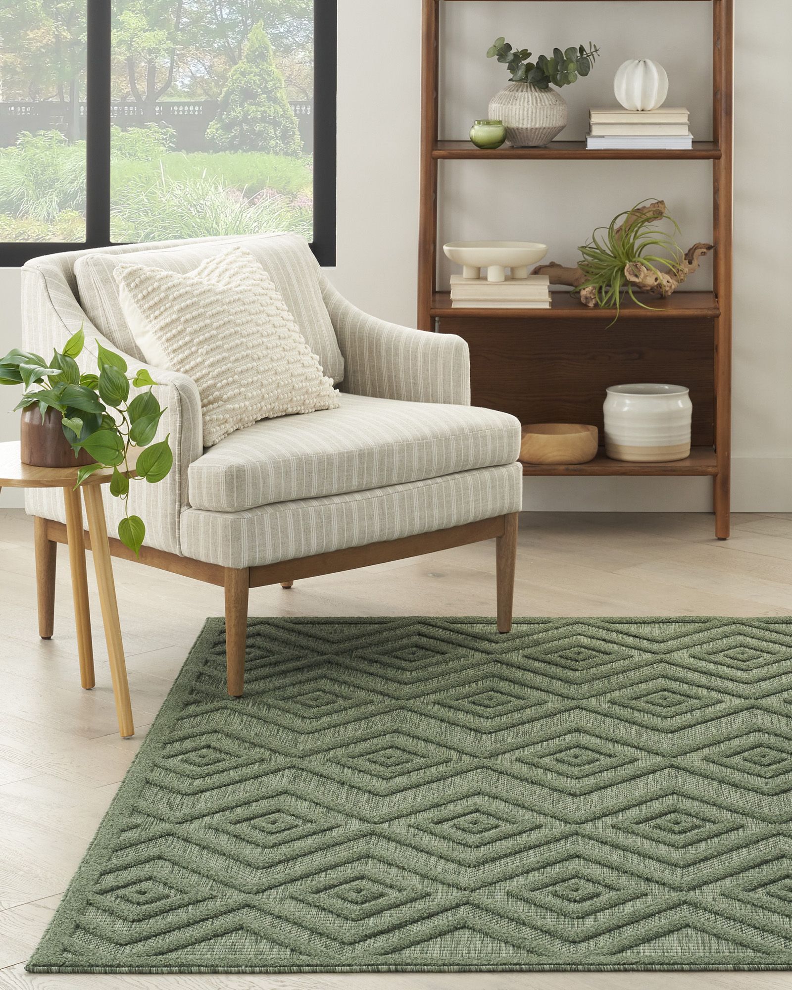 | Description | Enhance your indoor or outdoor space with the contemporary appeal of an outdoor rug from the Nourison Versatile NRV01 Green Collection. These dynamically textured rugs feature a flatwoven ground with raised designs that feel incredibly soft to the touch, adding an instant layer of depth to just about any space – from living room and dining room to patio, porch, or deck. Machine-made from a blend of durable polypropylene and polyester fibers that are easy to clean: just hose rinse and air dry. |